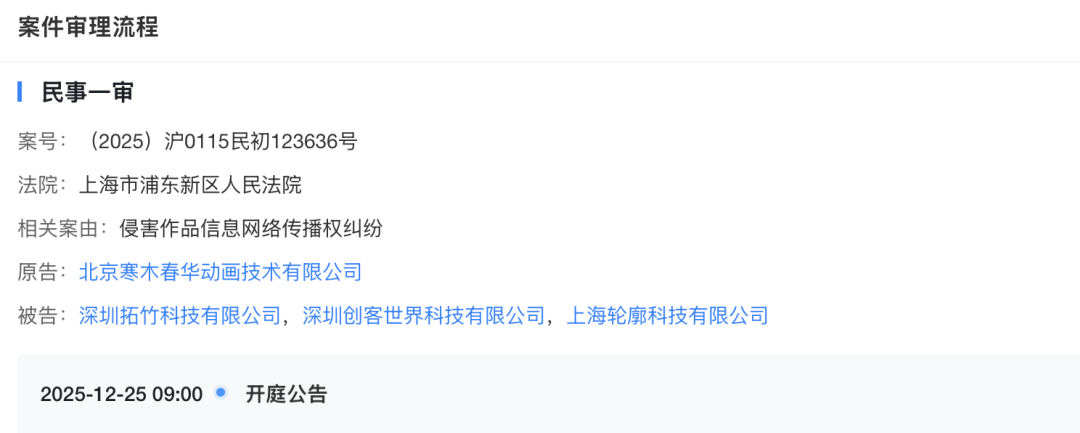事实上,向拓竹科技提起诉讼的不止泡泡玛特一家。据天眼查显示,此前,北京寒木春华动画技术有限公司也曾因“侵害作品信息网络传播权”向拓竹科技提起诉讼,寒木春华是知名动画作品《罗小黑战记》的版权方,目前案件已进入民事一审。