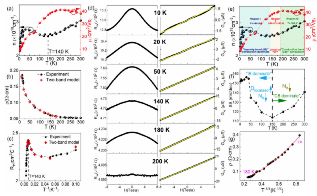 图3β-Ga2O3薄膜在不同温度下的电学特性:(a)载流子浓度n和迁移率μ,其中n在140K出现最小值;(b)电阻率ρ和(c)霍尔系数RH,红菱形标记为双带模型计算结果与实验数据精确吻合;(d)Rxx(H)曲线显示T≤180K时出现核磁共振(NMR)信号,表明杂质带(IB)存在,且Gxy(H)的双带模型拟合良好(黄色实线);(e)β-Ga2O3薄膜及FinFET器件中划分的三个温度区间导电机制总结;(f)亚阈值摆幅(SS)异常行为的解释,归因于T