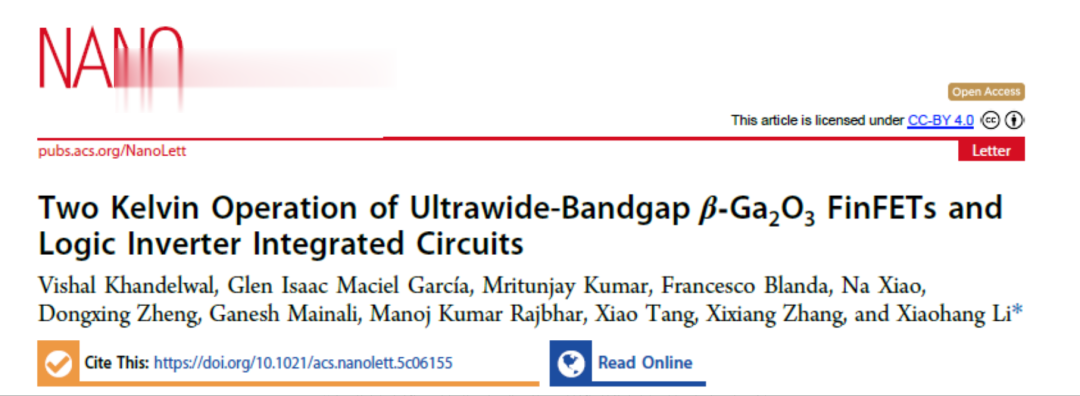 近期,沙特国王科技大学李晓航教授研究团队首次实现了超宽禁带β-Ga₂O₃鳍式场效应晶体管(FinFETs)及逻辑反相器集成电路在2K极低温下的稳定工作,这是超宽禁带半导体在低温电子学领域的重大突破。研究成果以“TwoKelvinOperationofUltrawide-Bandgapβ-Ga₂O₃FinFETsandLogicInverterIntegratedCircuits”发表于《nanoletters》上。