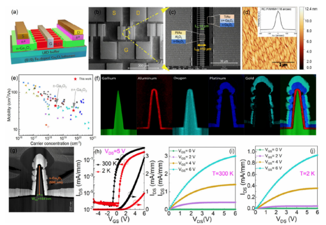 图1β-Ga2O3FinFET器件:(a)三维结构示意图;(b)顶部SEM视图标注源极(S)、漏极(D)和栅极(G);(c)鳍式沟道区域放大图显示接触间距LCH=LSD=10μm,栅长LG=4μm。掺硅β-Ga2O3薄膜:(d)原子力显微镜(AFM)表面形貌显示RMS粗糙度1.1nm,插图为(020)晶面XRD摇摆曲线,半高宽105弧秒;(e)PLD法制备n-/n+型β-Ga2O3薄膜性能与文献对比;(f)关键元素的电子能量损失谱(EELS)成像;(g)鳍式结构横截面TEM图像及尺寸标注;(h)300K和2K下VDS=5V时的转移特性曲线;(i)(j)分别为300K和2K下不同栅压VGS的输出特性曲线。