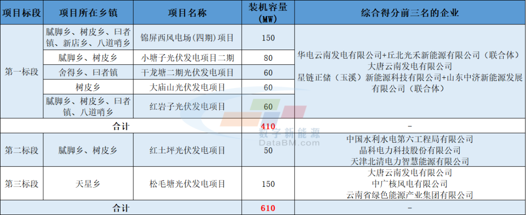 根据公示,云南丘北县2025年第二批新能源项目第一标段综合得分前三名的企业分别为:华电云南发电有限公司+丘北光禾新能源有限公司(联合体)、大唐云南发电有限公司、星链正储(玉溪)新能源科技有限公司+山东中济新能源发展有限公司(联合体)。