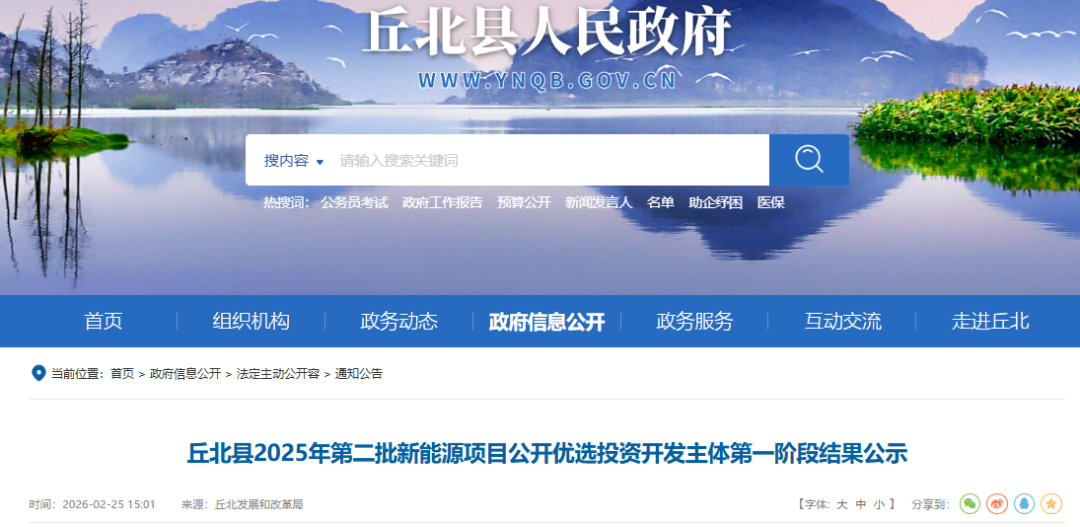 数字新能源DataBM.com获悉,2月25日,云南丘北县发改委发布关于“丘北县2025年第二批新能源项目公开优选投资开发主体第一阶段结果公示”。