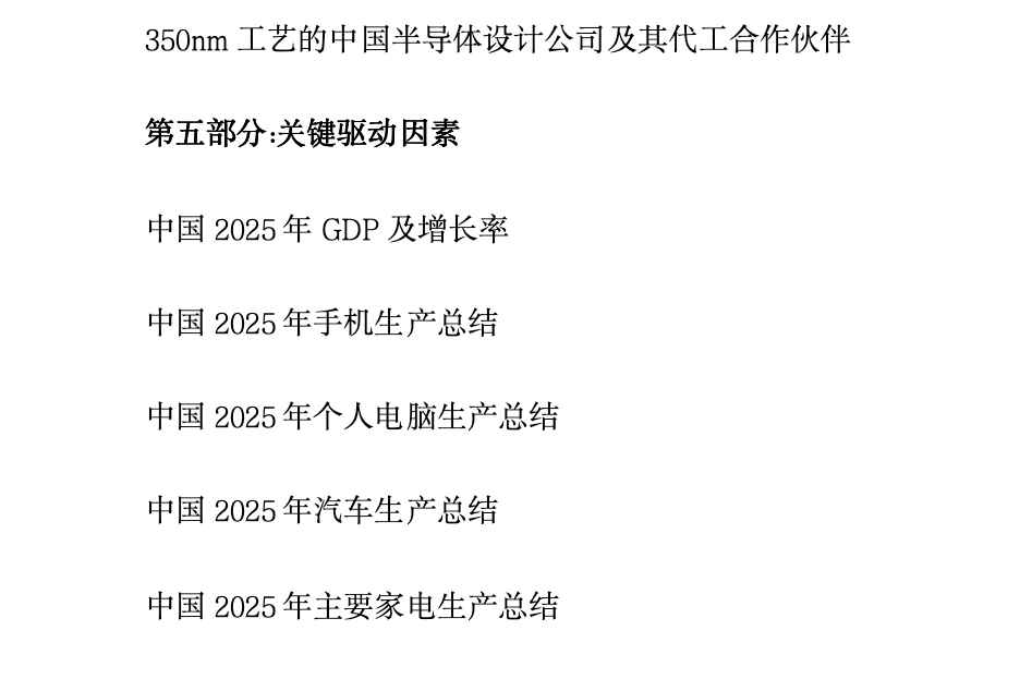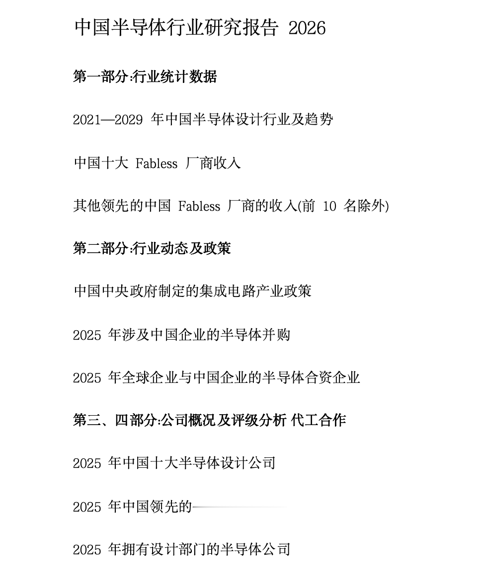 🔹《中国半导体行业研究报告2026》——全产业链全景扫描,从政策、技术、市场三维度分析产业趋势,覆盖重点企业动态以及代工合作情况。