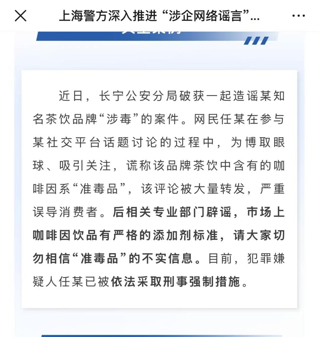 造谣挨铁拳,马督工进局子! 马督工造谣霸王茶姬咖啡因含量过高,是准毒品。已被上海警方采取刑事强制措施。 汉奸造谣早该挨铁拳了,毒品有成瘾性,我喝了这么多次霸王茶姬也没成瘾啊。哪能放任这种汉奸胡说八道。马督工 霸王茶姬 总部港霸王茶姬