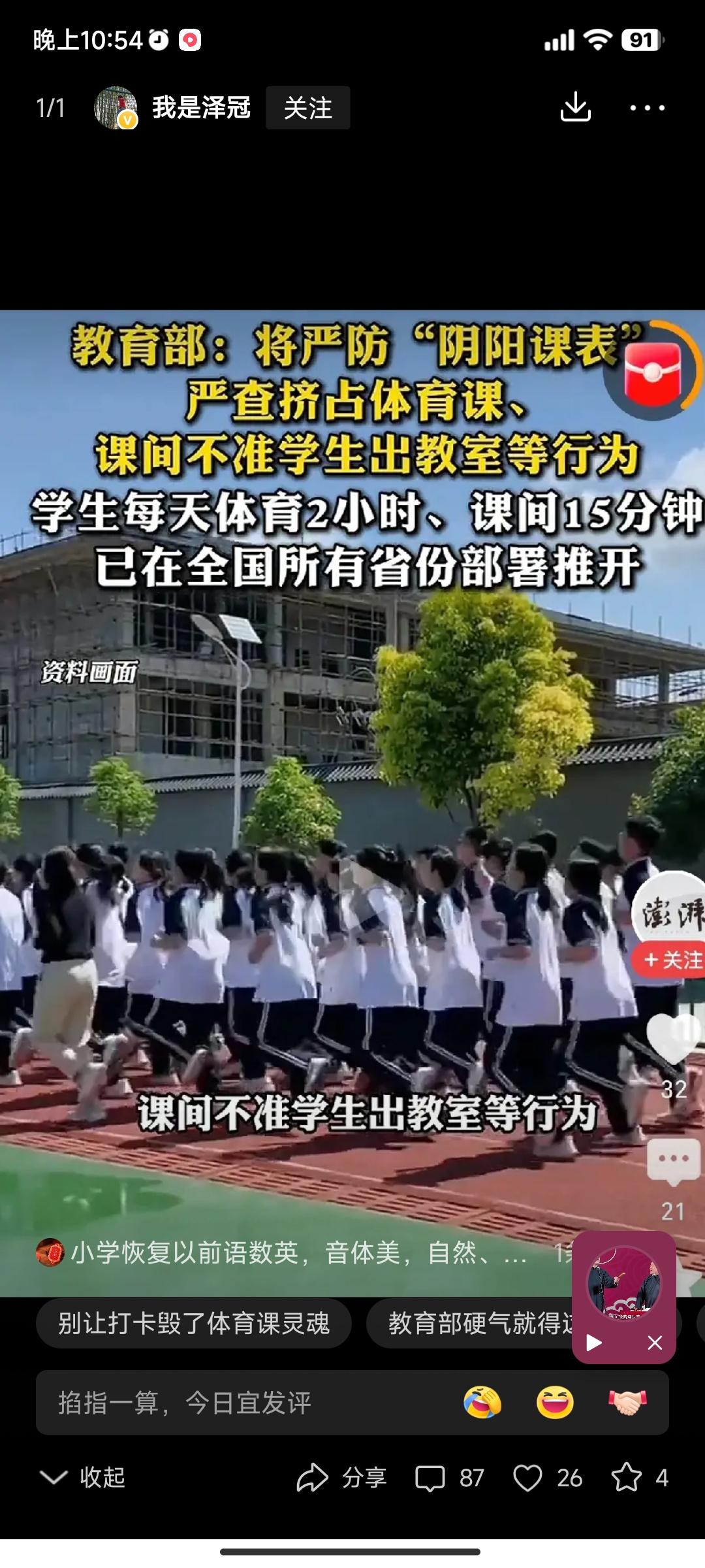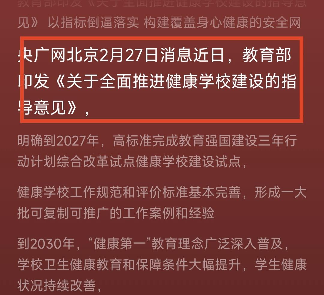 今年教育的头等大事,打造健康校园。具体来说有3点,第一,保证每天一节体育课。第二