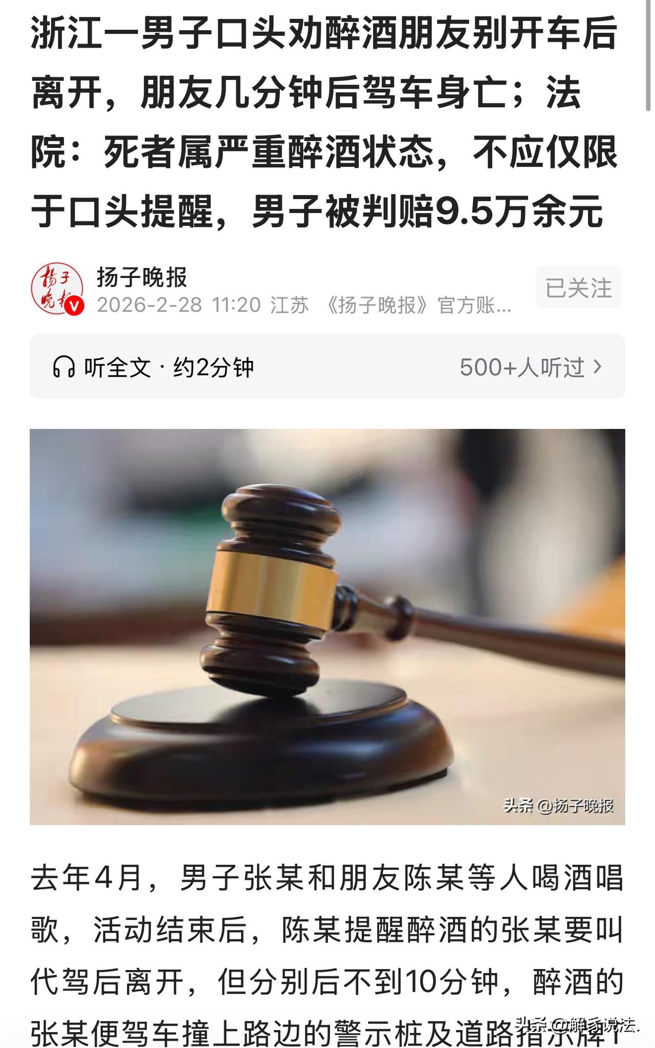 浙江,男子和朋友等人聚餐唱歌,席间男子没少饮酒。完事后,男子身体直打晃,已经是醉酒状态,朋友提醒他叫个代驾,别自己开车回去了,不安全。男子嘴上答应的好好的,朋友一走,就晃晃荡荡的钻车里去了,谁知,刚行驶10分钟,就撞上路边的警示桩及道路指示牌T型杆,引起车辆自燃,当场身亡。男子家属听到这个噩耗后,悲痛欲绝,认为朋友明知男子醉酒,还放任自己开车回家,存在一定责任。一纸诉状将朋友告诉上法庭,要求承担赔偿。朋友感到很冤枉,委屈的说:我明明提醒了、劝了,他自己答应了又反悔,难道也要我来担责?法院的判决很意外! 去年4月的一天晚上,张某心情不错,约上好朋友陈某还有几个哥们,找了家KTV喝酒唱歌。 一屋子人吵吵闹闹,啤酒一瓶接一瓶开,你敬我一杯,我回你一圈,气氛越喝越嗨。 朋友们都知道他酒量不行,也没人劝他多喝,喝多和少随心情。 张某自己想放松放松,脑子一热就敞开了喝。 一开始还能跟着唱两句,到后来说话都大舌头,脚步也发飘,眼睛看东西都重影,整个人晕乎乎的,满脑子都是,没事,我能行。 陈某一直陪着喝,但还算清醒,看着张某醉成这样,心里直犯嘀咕:这状态别说开车,走路都走不直。 一直玩到后半夜,大家才陆续散场。出门的时候,夜风一吹,张某更迷糊了,晃悠着就要去掏车钥匙。陈某赶紧上前一把拉住他,反复叮嘱:你都醉成这样了,千万别自己开车,赶紧叫个代驾,安全第一! 张某当时满口答应:知道知道,放心吧,我肯定叫代驾,不瞎开。 陈某看他应得挺痛快,又想着都是成年人,应该能管住自己,嘱咐几句就先离开了。 可谁也没料到,这一分别,竟是最后一面。 陈某走了还不到10分钟,另一边就出了大事。 张某嘴上答应得好好的,等朋友一走,酒劲一上头,侥幸心理直接占了上风:就这么点路,半夜路上也没车,我慢慢开肯定没事,叫代驾还得等,多麻烦。 他迷迷糊糊拉开车门,发动车子,刚开出去没多远,手脚就不听使唤了。 视线模糊,反应迟钝,车子歪歪扭扭往前冲,直接狠狠撞上路边的警示桩,又狠狠怼在T型道路指示杆上。 巨大的撞击力之后,车子很快冒起烟,紧跟着就烧了起来,火光冲天。 等有人发现报警,消防和急救赶到时,一切都晚了,张某当场身亡。 好好一个人,一场酒局,短短十分钟,就这么没了。 家里顶梁柱一倒,张某的家属悲痛欲绝,情绪完全崩溃。好好的人出去喝酒,怎么就没了? 他们思来想去,把矛头指向了当晚一起喝酒的陈某认为是陈某没有尽到劝阻、照顾的责任,明明知道张某醉酒,却没死死拦住他开车,这才酿成悲剧。 最后,家属一纸诉状,把陈某告上了法庭,要求对方承担赔偿责任。 曾经的好朋友,因为一场酒后悲剧,闹到对簿公堂。 陈某也满是委屈和无奈:我明明提醒了、劝了,他自己答应了又反悔,难道也要我来担责? 《民法典》第11165条第1款行为人因过错侵害他人民事权益造成损害的,应当承担侵权责任。 法律早已明确,行为人因过错侵害他人民事权益造成损害的,应当承担侵权责任。张某醉酒程度已达177mg/100ml,属于严重失去自控能力的状态,此时仅靠口头提醒远远不够。 共同饮酒人不能只说一句“别开车”就撒手不管,更要尽到实际的照顾义务,真正把安全措施落到实处。 因陈某其未能充分尽到对醉酒同伴的合理照顾与安全保障义务,存在一定过错,该过错与事故发生具有一定的因果关系。 《民法典》第1173条规定:被侵权人对同一损害的发生或者扩大有过错的,可以减轻侵权人的责任。 张某自己醉驾、不听劝,是主要过错方,自己承担绝大部分责任;陈某只是没做到位,只承担小部分责任。 因此,陈某对遵循过错与责任相适应的原则,认定被告陈某对原告的损失承担5%的赔偿责任。 法院判决陈某赔偿张某家属各项损失95898.5元。 对此判决结果,网友说法不一: 这个罚得好!狐朋狗友喝酒唱歌出人命,必须罚! 这样说的话酒厂也应该赔钱,也应该尽到提醒,劝阻的义务和责任! 一个具有完全民事行为能力的人,在做事的时候,就该对自己的所作所为负全部责任!如果别人按住猛灌那是别人的事!