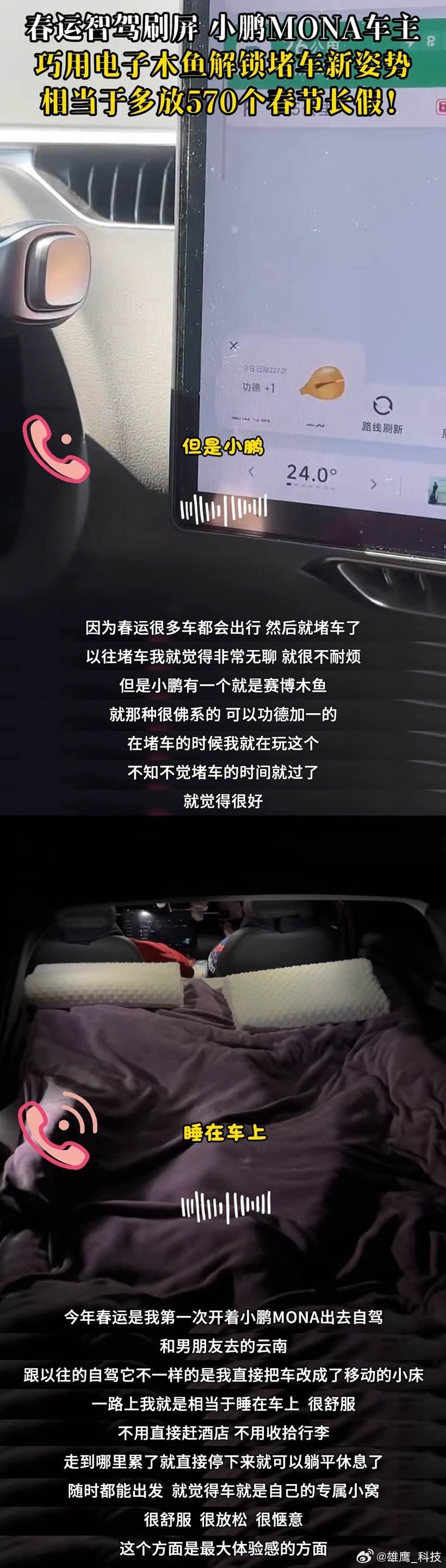 小鹏MONA春节智能辅助驾驶报告来啦!数据显示,春节期间车主使用智能辅助驾驶的里程竟达平日的3.5倍,总时长相当于多放了570个春节长假,智能辅助驾驶大幅缓解驾驶长途疲惫。而面对春运拥堵,小鹏MONA也别出心裁,车载电子木鱼成了年轻车主堵车时解压的新方式,紧跟当下情绪消费潮流。实用智能与情绪价值双在线,小鹏MONA成功成为年轻人春运出行的热门之选。小鹏MONA春节智能辅助驾驶报告小鹏MONA治好年轻人的春运焦虑
