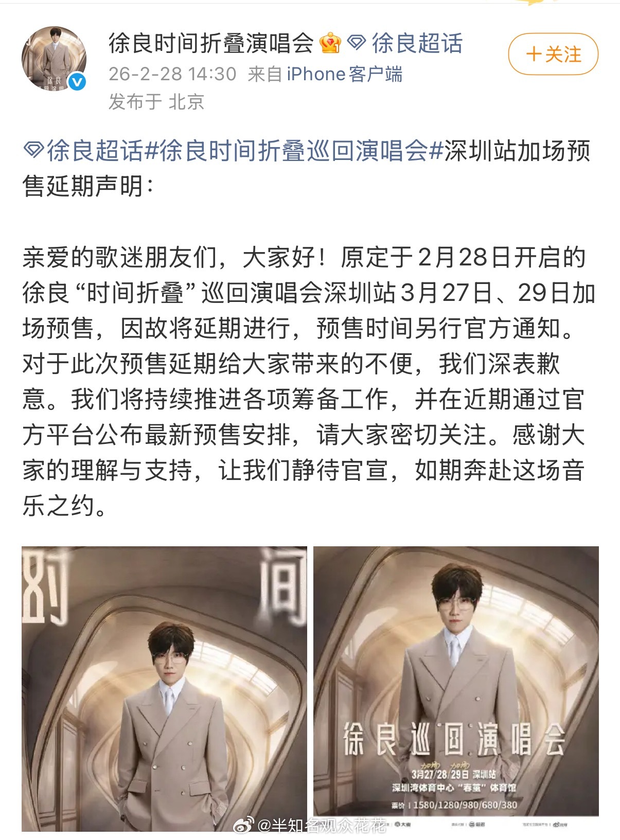 回看徐良每一次官宣都走心又真诚,第一次开演唱会虽然加场预售延期,但是期待值只增不减,给足他准备时间,才能迎来最完美的现场,坐等好消息徐良的舞台永远值得期待!!!