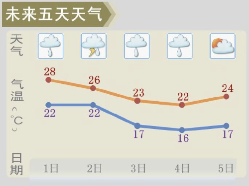 预计,未来一周前期温暖湿润,多阴雨,中后期受冷空气影响,气温下降,天气渐转干爽。天气不稳定,请留意最新预报预警信息,注意防御局地强对流天气。