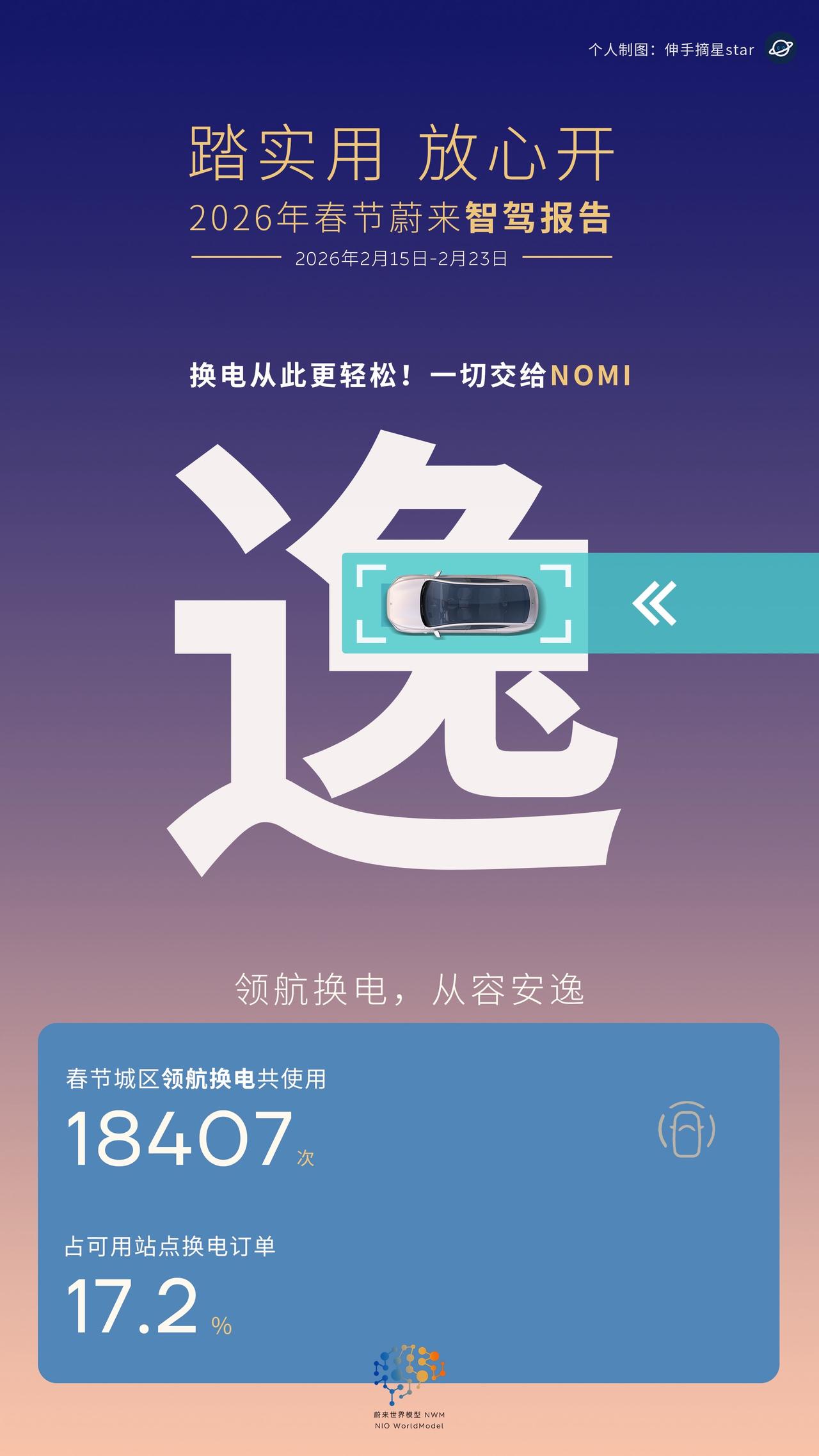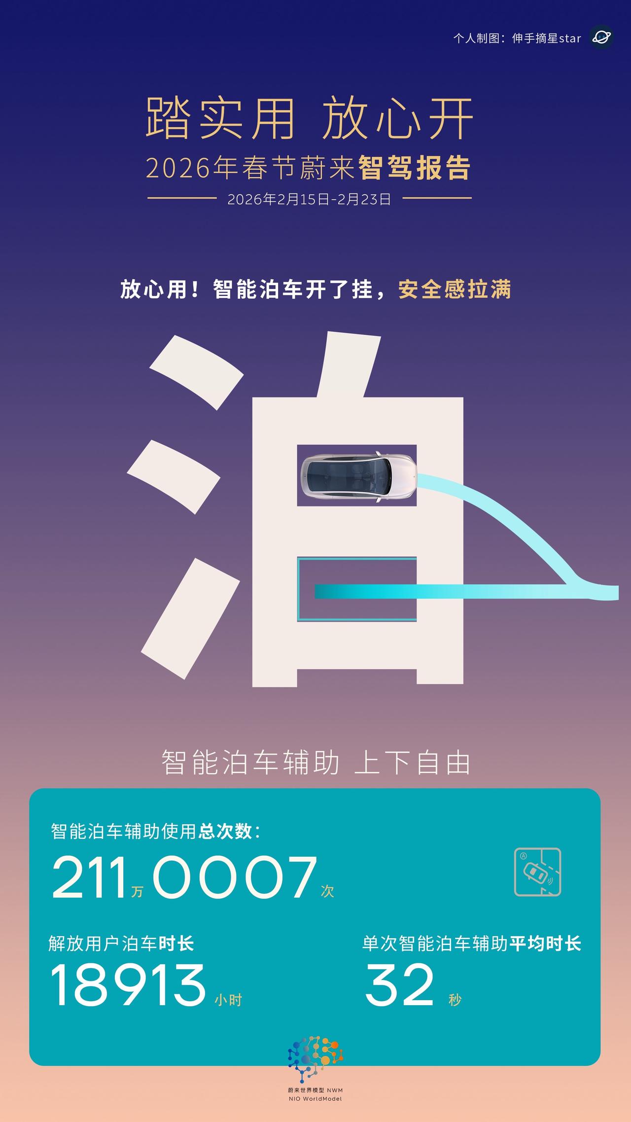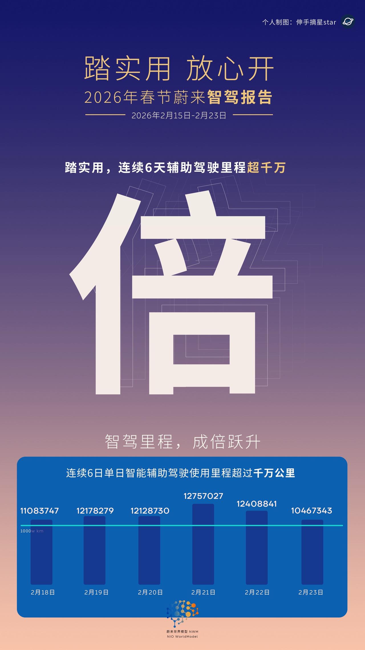 344%的增长背后, 是蔚来NWM世界模型真“站起来了”! 蔚来这次春节智驾报告, 只能用两个字形容:NIO BEE! 如果说以前我们对蔚来辅助驾驶,还抱有疑虑, 那这个春节,蔚来用户用行动给出了最直给的回答: 愿意开,安心用,爱不释手。 ✅ 城区智驾时长激增344% —— 大家是真的敢用了,也是真的爱用了! ✅ 春节智驾总里程逼近1亿公里 —— 同比大增73%,这是辅助驾驶进步最好的证明。 ✅ 单人单日极限1946公里 —— “换电+NWM”叠满Buff, 重新定义了纯电长途驾驶的天花板。 作为一个提前开启春节模式的车主,我亲历了这一切。 节前家庭旅行+春节往返,狂刷近3000公里, 全程使用辅助驾驶NWM。 那种丝滑的逻辑判断(选道准+超车效率高), 尤其是春节前版本对国道限速的精准优化, 让我深刻体会到: 蔚来的世界模型,真正“站起来了”! 虽然因为时间差,我的这3000公里没算进官方报告里, 但这丝毫不影响我对NWM的信心。 数据不会说谎,体验更不会骗人。 从“不敢用”到“爱不释手”, 蔚来只用了这一个春节。 踏实用,放心开这就是蔚来世界模型NWM的进化论! 辅助驾驶 蔚来智驾 蔚来世界模型 蔚来