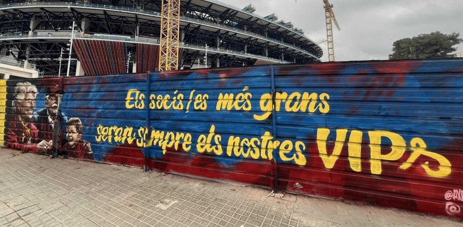据了解,该涂鸦由街头艺术家AxeColours和Ivokaima创作,画面中写有“Elssocis/esmésgransseransempreelsnostresVIPs”(年长会员永远是我们的VIP)等口号,强调应更加重视资深会员,以强化他们对俱乐部的归属感。
