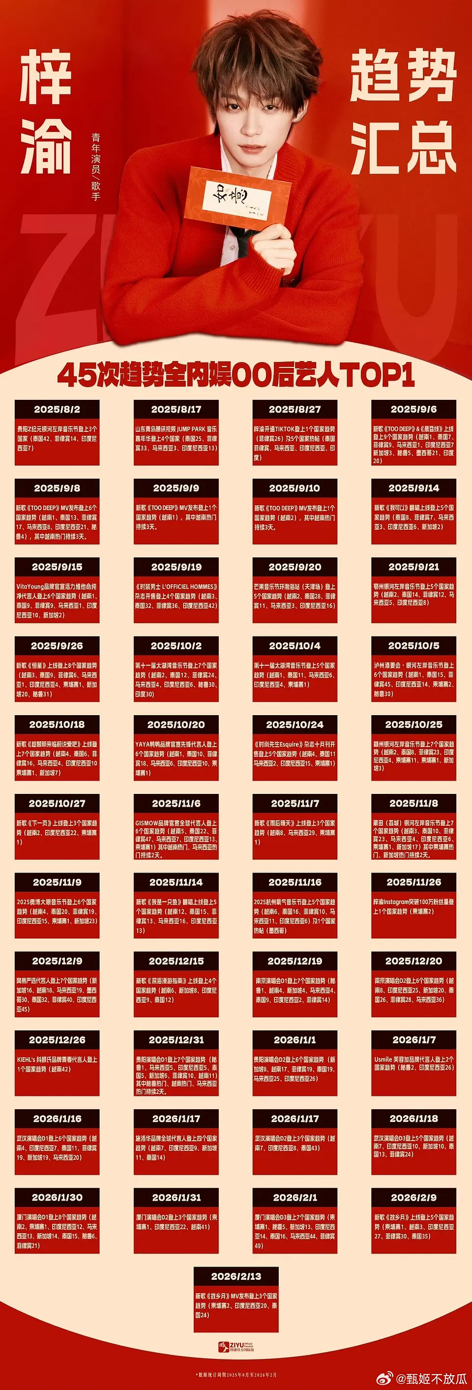 恭喜🎉梓渝达成世趋次数24次,内娱00后TOP1。 海外趋势次数45次,内娱0