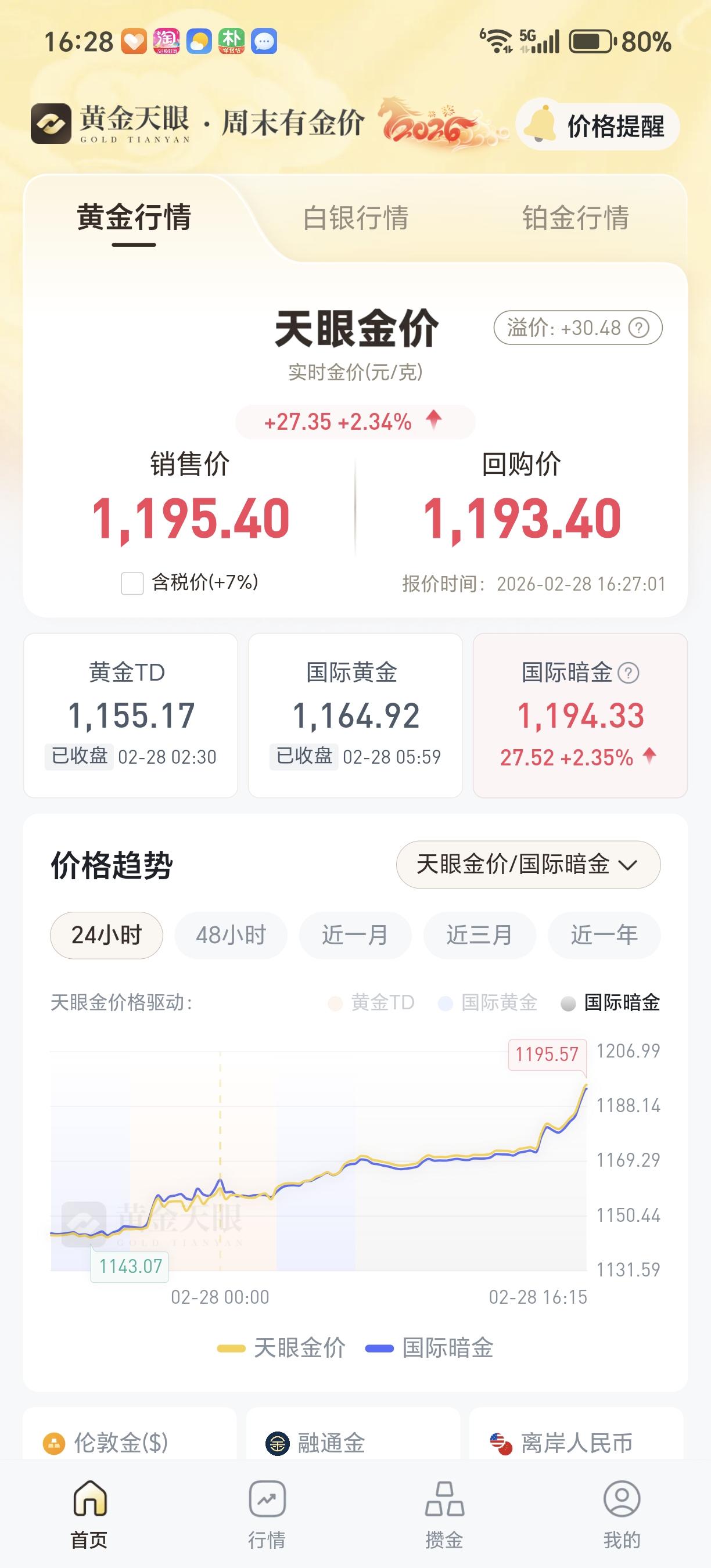 ,显示价格是每克1167元,但是黄金天眼里面看到的价格已经到了11 95.40每克! 涨势喜人啊! 下周一上午,招行积存金可以交易的时候,是不是也是1195元每克呢 ?那我就要卖出一些了。 我去年12月才开始买积存金,1月末涨到1239我都不知道抛,以为要长期持有,没想到2月初大回调,好在现在又涨上去了。