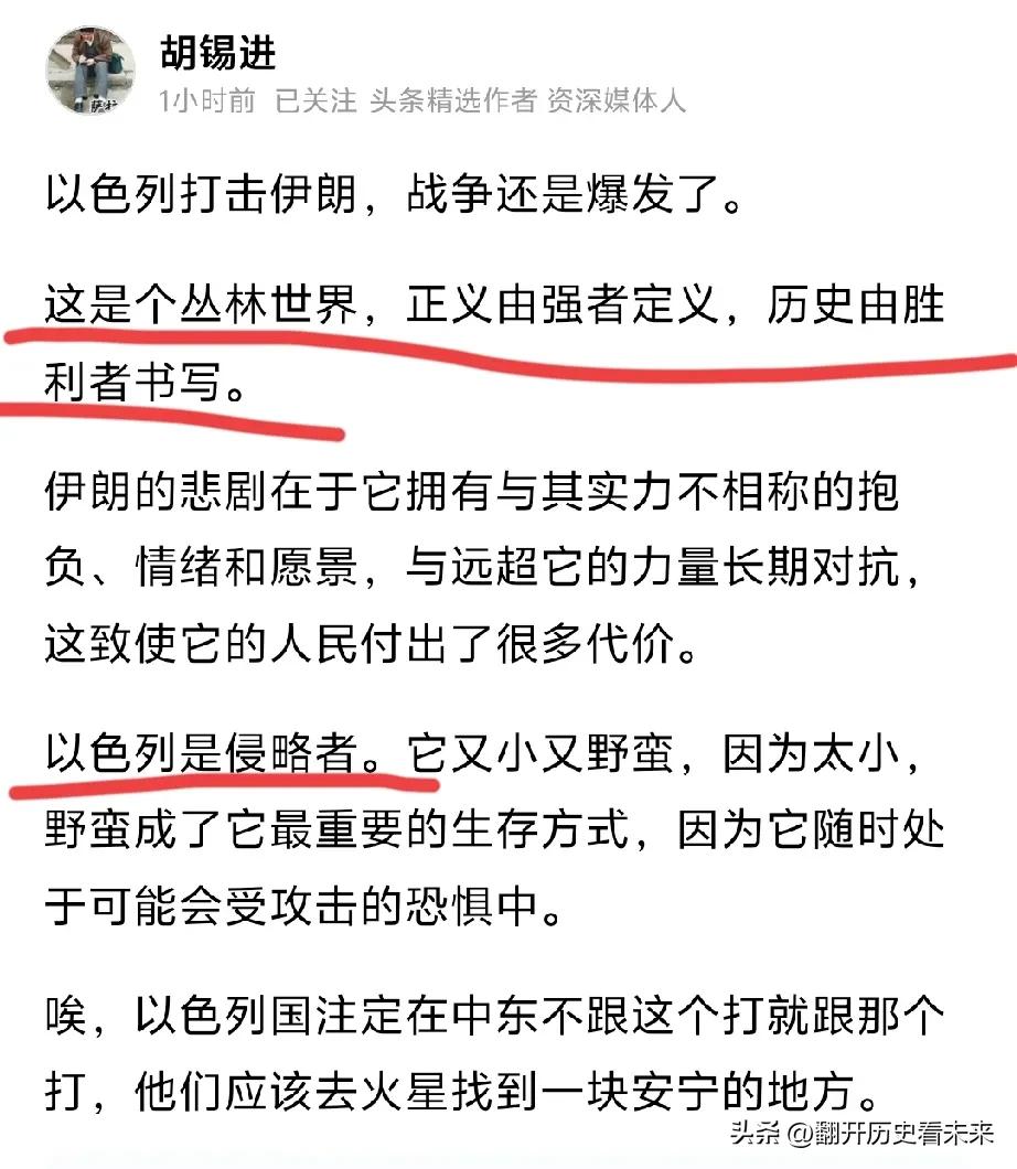 老胡认为以色列打击了伊朗,然后以色列 就是侵略者! 我个人跟老胡的观点不太相同,正所谓地位不同立场也不同! 我自己是一个普通人,所以我更愿意站在伊朗普通人的立场。 如果站在伊朗“教士们”的立场来看的话,以色列和老美当然是侵略者。 如果站在伊朗普通人的立场来看的话,说不定以还是“解放者”。 毕竟伊朗普通人的日子很难熬,外面人来打一打、变一变也未尝不可。 有句话说得好,现在都已经差成这样了,变了之后又会差到哪里去呢?说不定还变好了!