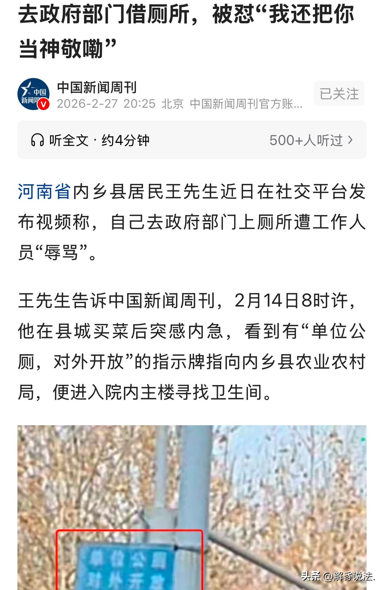 “好大的官威呀!”河南,男子去政府部门借厕所,询问门卫人员厕所往哪走,对方,指着他鼻子,呵斥:你眼睛瞎了吗?男子气愤不已,拿出手机录视频,对方直接把大门关上了,嘴里还骂骂咧咧:我还把你当神敬呀?男子咽不下这口气,将事情曝光到网上,要求对方道歉,或单位领导代为道歉。当地部门就此事发布了通报,做出这样的回应! 2月14日一大早,市民王先生买完菜,正往家走,肚子突然一阵疼痛,急着想上厕所,简直是火烧眉毛。 他夹着裤裆,生怕一不小心控制不住,都丢人丢大发了。 人有三急没办法,眼下最要紧的是找个厕所,赶紧解决掉。 好巧不巧的,他一抬眼睛,就看见不远处的农业农村局门口,挂着个明晃晃的牌子,上面的几个大字格外显眼:单位公厕,对外开放。 王先生想着这下可算救了急,赶紧捂着肚子往院里走。 大门开着,王先生刚进院子,值班室里就出来一位穿制服的工作人员魏某。 王先生客客气气地问:哥们儿,我有点急,请问厕所往那边走! 谁知,对方连正眼都没瞧他,没好气的怼了他一句:你眼睛瞎了?不会看指示牌吗? 王先生一下就懵了。 他高度近视,早上没戴眼镜,眼前一片模糊,小字根本看不见。 他只能忍着气,赔着笑再问一遍:实在抱歉,我没戴眼镜看不清,麻烦说一下在几楼?二楼吗? 结果对方更横了,直接指着他鼻子吼:你不会自己看?还要我教你? 王先生又急又臊,脸瞬间涨得通红。 一边是生理上的难受,一边是被人当众羞辱,心里委屈得不行。 可实在憋不住,也没力气吵架,只能忍气吞声,自己在附近摸索着找到了厕所。 等解决完急事,王先生心里的火彻底压不住了。 这厕所明明写着对外开放,自己只是问个路,至于这么凶吗? 就是问个厕所就这态度,要是来办事的老百姓,还不知道要受多少气? 他咽不下这口气,出门就想找对方理论,要求道歉。 可魏某根本愿意搭理他,直接把院子的电动大门给关了。 王先生更气了,他直接掏出手机手机录像,对方可能是怕事闹大,又把门重新打开。 但嘴上不饶人:我还把你当神敬嘞!你今个是闲着没事干了是吧? 此时万先生看着门口写着“为人民服务”,觉得莫名的讽刺。 事后,王先生当场把这算视频发到了网上。 让网友给评评理。 网友给出了不同看法: 那个厕所,是用纳税人的钱建造的,不是公职人员的专用。 我曾经误入一单位,因为两单位门挨门,没看清牌子,遭门卫严厉呵斥,说没长眼,灰溜溜滚出来,至今心理还有阴影! 我也借用过政府单位的厕所,说明来意,都会让用的,值班人员也客客气气的,只要不是胡搅蛮缠。肯定是当事人语言说话有问题。 这样的工作作风,这样的服务态度,马上下岗,是对他最好的惩治 这样的工作人员给城市,带来了很坏的影响,给外地游客的心灵造成了很大的阴影,这样的服务态度,这个城市谁敢来? 随着舆论发酵,当地部门就发布了通报:情况属实,涉事门卫魏某虽为企业职工,但在岗期间代表单位形象,被责令公开道歉,并接受严肃处理。同时,农业农村局立刻开展作风纪律整顿,下决心整治“门好进、脸难看、事难办”的问题。 《民法典》第1024条规定:民事主体享有名誉权。任何组织或者个人不得以侮辱、诽谤等方式侵害他人的名誉权。 在公共场合辱骂他人、贬低人格,已经侵犯公民名誉权,受害人有权要求道歉、消除影响。 《劳动合同法》第39条规定:劳动者严重违反用人单位的规章制度,或严重失职、营私舞弊,给用人单位造成重大损害的,用人单位可以解除劳动合同。 魏某在岗期间公然侮辱群众、严重违反工作纪律与职业道德,严重损害单位形象。 他代表单位值守,却对求助群众辱骂刁难,引发网络舆情,造成恶劣社会影响,属于严重违纪、损害单位声誉,单位依法辞退、追责完全合理合法。 一件小事,照出了作风的大问题。对外开放的不应该只是一扇门、一间厕所,更应该是一颗真心为群众办事的心。少一点嚣张,多一点耐心,别再让一句冷言恶语,寒了老百姓的心。