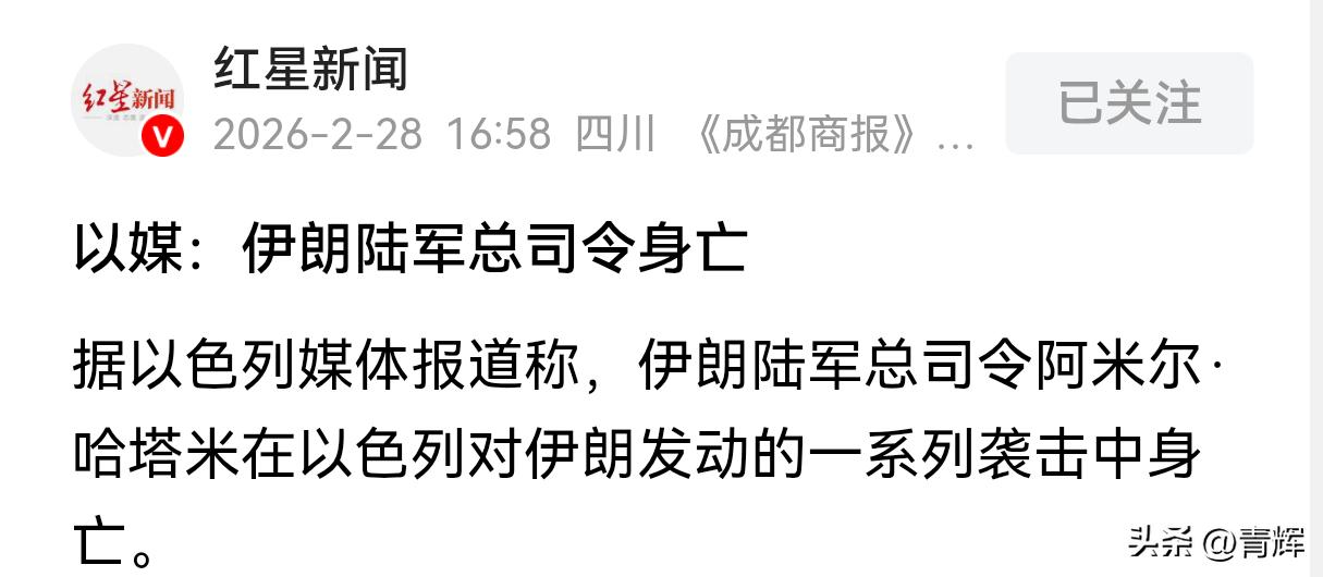 这不扯吗,战斗才刚开始打总司令就阵亡了 28号当天上午,伊朗境内包括德黑兰在内的多处重要地点遭到猛烈空袭。随后特朗普表示,在以色列发动导弹袭击之后,美国已经开始在伊朗展开大规模的作战行动。 随后以色列媒体对外声称,伊朗陆军总司令阿米尔在以色列对伊朗发动的空袭中已经身亡。 这就有点扯了,战斗才刚打起来就损失了一名总司令,战局对伊朗来说可以说十分不利。23号当天,阿米尔还在德黑兰伊斯兰革命卫队指挥与参谋大学的毕业典礼上表示,敌人虽然很强大,虽然声称自己刀枪不入,但不过是一个谎言而已。美国虽然已经向中东部署了包括航母在内的军事装备,但是这个超级大国不会料到会遭到伊朗如此坚定的抵抗。 万万没有想到这话说了才5天,这位总司令就当场阵亡了。除此之外,根据以色列媒体的消息可以得知,战争一打响伊朗最高领袖和总统的驻地附近就遭到了至少7枚导弹的攻击。这一系列的动作都说明美军和以色列这次对伊朗采取的军事行动是有的放矢,是提前已经获得了一些精准的坐标和重要人物活动范围,然后才进行了打击。目前伊朗也已经进行了回击,这场战争最终会走向何方,还需要后续观察。