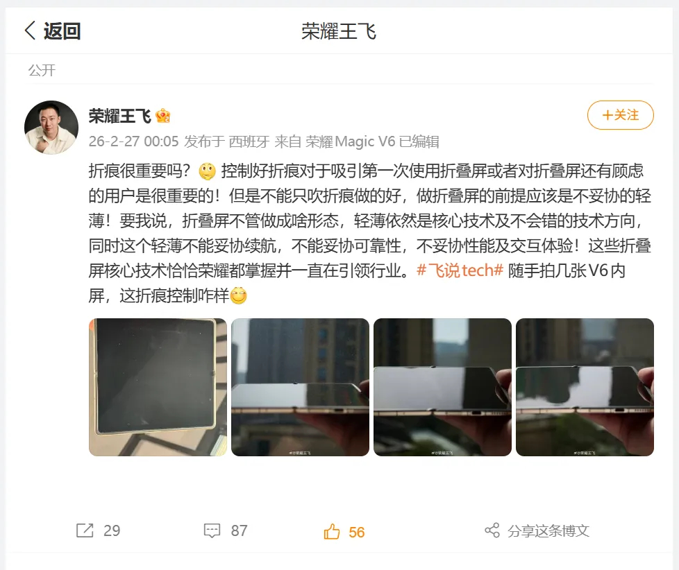 说真的,还在拿放大镜找折叠屏折痕的兄弟可以歇菜了。荣耀王飞刚晒出Magic V6的内屏实拍,在不同光照背景下折痕直接“隐身”。但这回王总把话挑明了,光吹折痕那是耍流氓,轻薄、续航、交互哪个都不能妥协。既要大电池又要手感不坠手,还得让强迫症看着舒服——这哪是叠手机,这是在叠 buff 啊! 看了王飞晒的图,这次Magic V6内屏平整度确实有点东西。