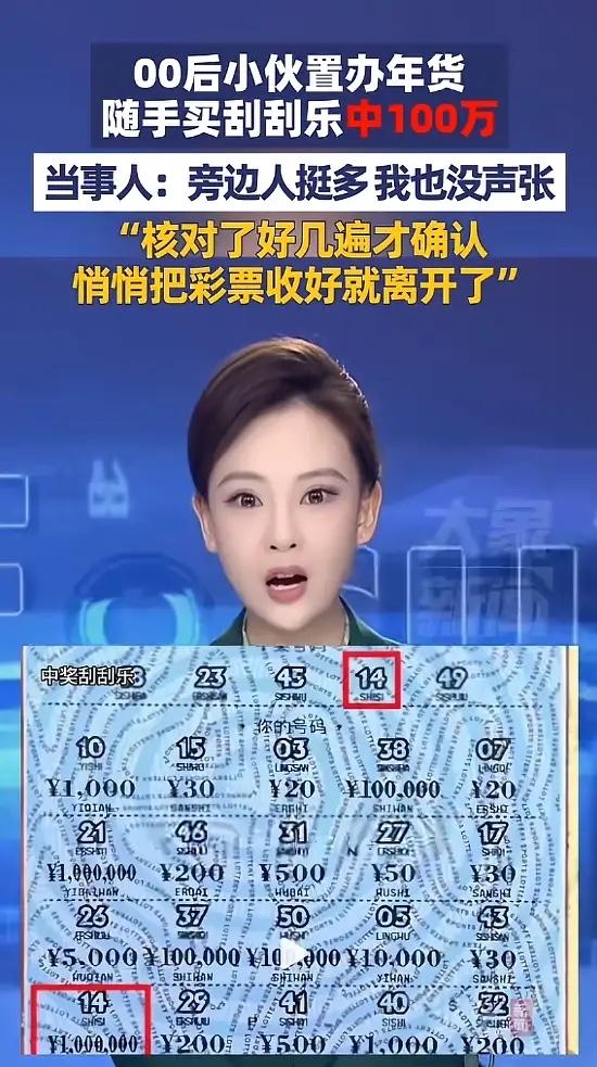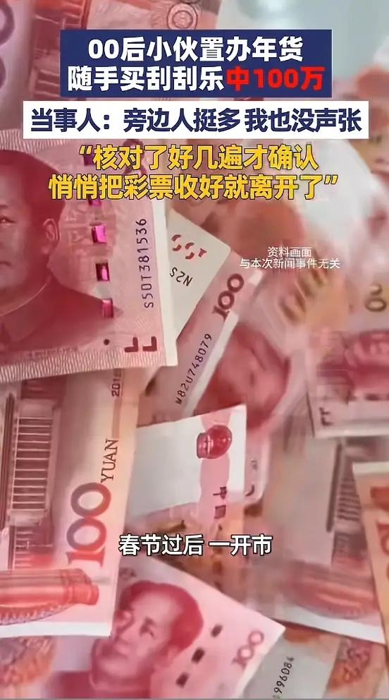 “这运气绝了!”近日,山东聊城,一小伙春节前去置办年货时,随手买了两张20元的刮刮乐,刮第一张时没中奖,没想到将第二张刮开时,竟中了100万元!他看着那一长串数字,仔细核对了好几遍才确认!网友:羡慕哭了! 这事发生在山东聊城东昌府区的万达广场。2月初,快过年了,商场里人挤人,到处都是置办年货的。00后的小刘也来买点东西,准备回家过年。他大学毕业没几年,一直在自己创业,开个小公司,日子过得挺辛苦。 路过体彩销售柜台,他看到那种叫“中国红”的刮刮乐,票面红彤彤的,特别喜庆。小刘心想,快过年了,图个吉利吧。他掏出四十块钱,买了两张。一张二十块,也不贵,就当玩个开心。 他站在柜台边,拿起硬币开始刮。第一张刮完了,啥也没有。小刘笑了笑,没当回事。接着刮第二张。刮开覆盖膜,下面露出一长串数字。他眯着眼睛凑近看,1后面跟着好几个零。个、十、百、千、万……一百万? 小刘揉了揉眼睛,把彩票拿起来,对着光又看了一遍。没错,就是一百万。他心跳得厉害,手都有点抖。他深吸一口气,悄悄把彩票折好,塞进钱包最里层。脸上啥表情也没有,就像什么都没发生。 这个春节,小刘过得有点不一样。那张彩票,他一直放在车里。开车的时候,总忍不住瞄一眼放彩票的地方。心里惦记着,又不敢跟家里人说。怕说了,万一不是真的,空欢喜一场。也怕说了,亲戚朋友都来问,麻烦。 正月初八,体彩中心新年第一天开门。小刘一大早就去了。办手续,核对身份,签字。奖金到手,扣完税,还有八十万。他心里那块石头,总算落了地。 记者问他,这笔钱打算怎么花。小刘想了想说,先存起来吧。他创业这几年,起早贪黑,吃过不少苦。公司规模小,想扩大,一直缺资金。这笔意外之财,正好能派上用场。把生意做大一点,招几个人,日子就能更好过。 小刘平时不怎么买彩票。偶尔路过,心血来潮买两张,纯粹图个乐子。他说以后还会这样,保持平常心。中奖是运气,日子还得踏踏实实过。生意还得好好干,不能指望天上掉馅饼。 四十块钱,换回一百万,这种概率比被雷劈中还低。可它就是发生了,发生在最普通的一天,最普通的人身上。运气这东西,说来就来,说走就走。抓不住,求不来。我们能做的,就是该努力时努力,该放松时放松。像小刘一样,中了奖不飘,继续干自己的事业。没中奖也不恼,日子照常过。 买彩票,就当给生活添点彩头。中了是惊喜,不中是常态。最重要的是,别把希望全押在这上面。脚踏实地,才是过日子的根本。你说是不是? 各位读者你们怎么看?欢迎在评论区讨论。