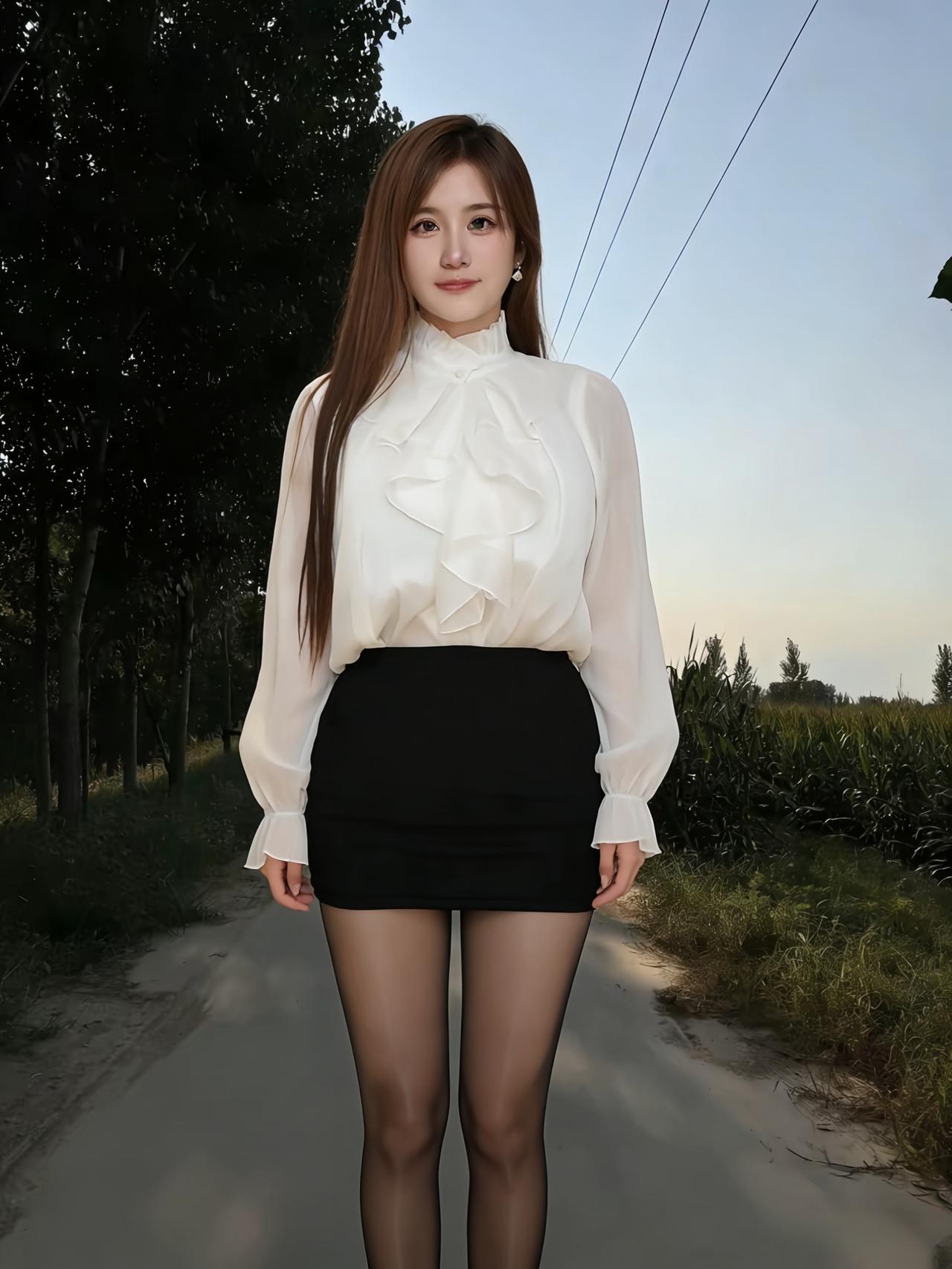 田埂的风掀动她的衣袂 白衫在绿纱帐里翻涌成浪 黑裙是墨色的蝶 停在风的中央 玉米叶擦过她的脚踝 把泥土的气息揉进丝袜的微凉 她走过的路 都成了被月光吻过的诗行 ~ 暮色漫上来时 她的轮廓在电线的经纬里淡去 像一幅洇开的水墨 留白处,是未名的远方 路灯把她的影子拉成弦 每一步都在弹拨人间的清响 她站在那里 让所有的田野都有了心跳