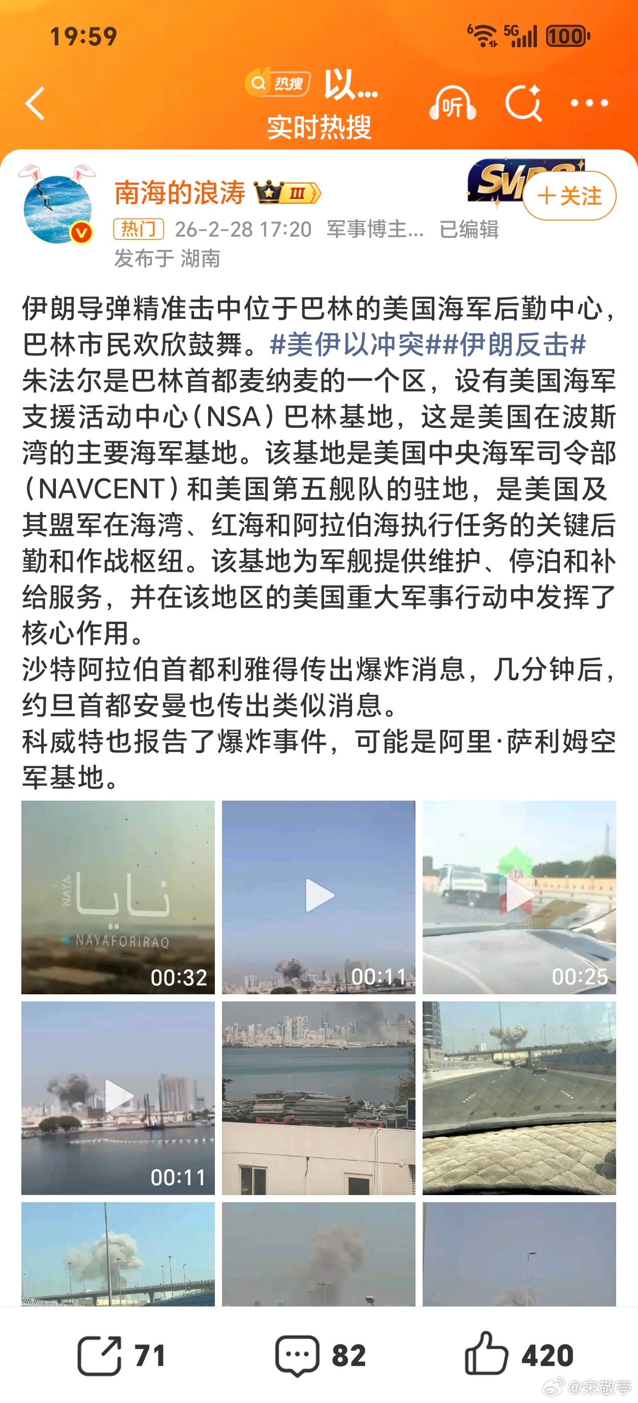 伊朗反击不仅打击以色列,伊朗导弹精准巴林的美国海军后勤中心,而且美军在卡塔尔、阿联酋、约旦、沙特、科威特等地的多个军事基地几乎都传出有爆炸画面了,看美国如何回应吧!