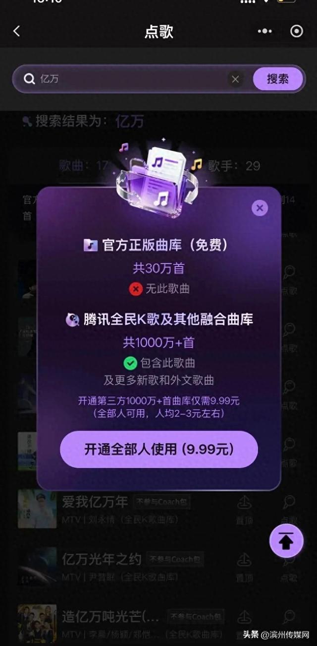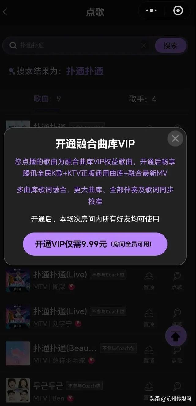 近日,多地有网友发帖称在魅KTV点歌需要额外付费,才能解锁全部曲库。据网友提供的图片,其在搜索“扑通扑通”歌曲时,弹出的页面显示“您点播的歌曲为融合曲库VIP权益歌曲,开通后,本场次房间所有好友均可使用。开通VIP仅需9.99元(房间全员可用)”。