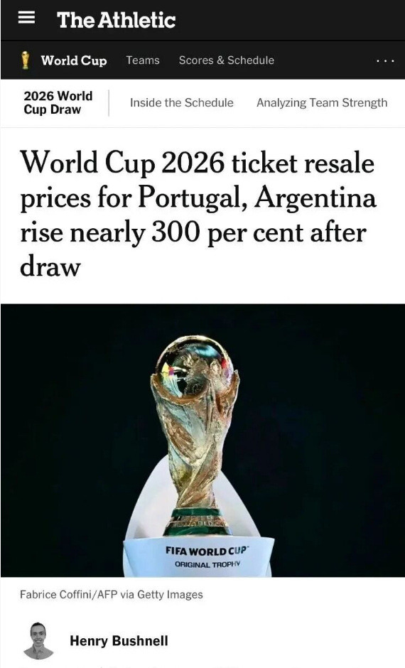 2026年美加墨世界杯小组赛抽签结果甫一公布,门票市场便掀起巨浪。一组对比数据引发热议:葡萄牙对阵哥伦比亚的比赛,二手市场平均票价已飙升至2189美元,涨幅高达惊人的514%。