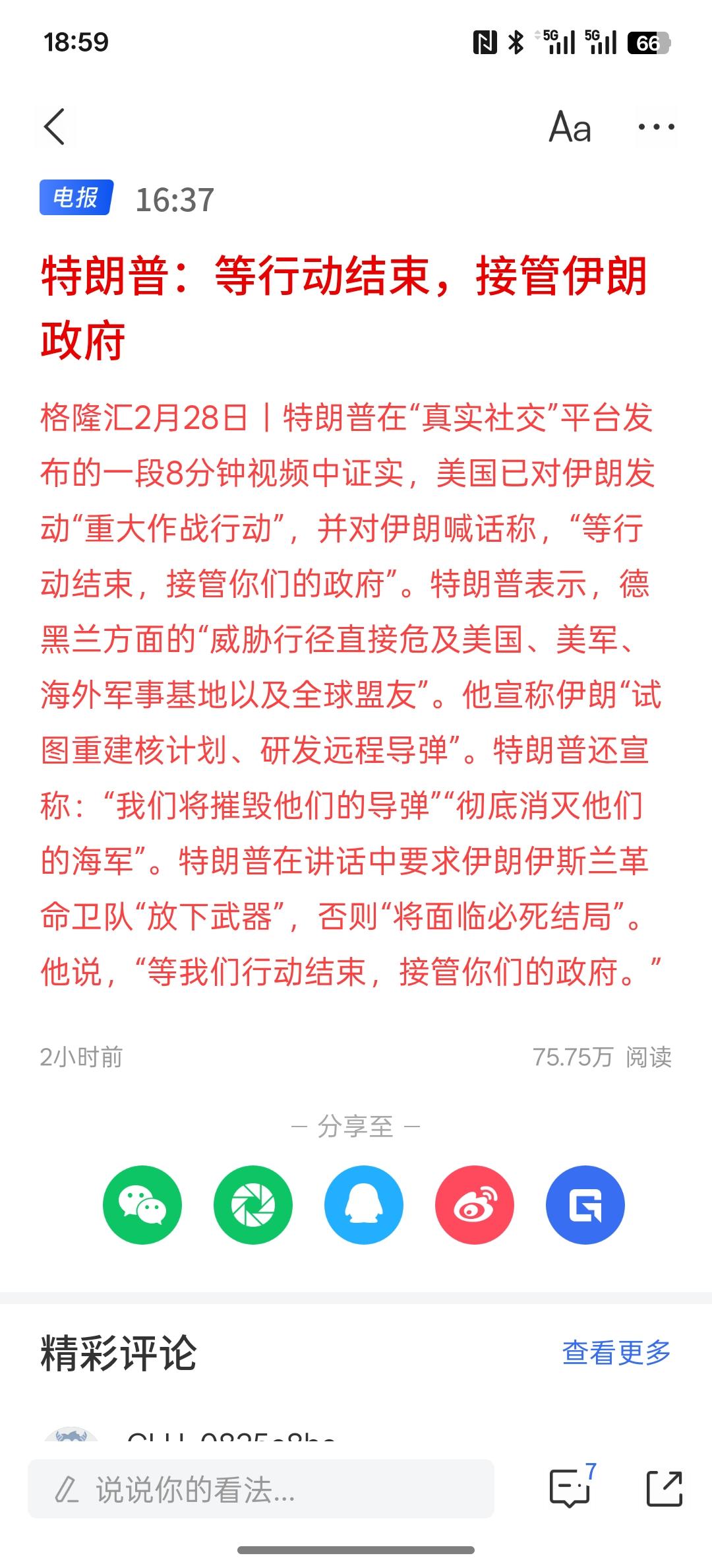 特朗普:等行动结束,接管伊朗政府!美国已对伊朗发起了重大行动!特朗普甚至扬言说,要摧毁伊朗的导弹军工体系!阻止伊朗研发核武器,阻止伊朗研发远程导弹!特朗普还说,伊朗人民自由呢! 特朗普要求伊斯兰革命卫队放下武器,如果不放下武器,否则只有死路一条!特朗普说,要摧毁伊朗的海军!把伊朗的导弹系统导弹都摧毁掉! 而且伊朗方面也做出了最强硬的姿态,已经开始反击,对以色列境内进行打击!如果美国陷入中东战争,短时间内很难结束此类行动!