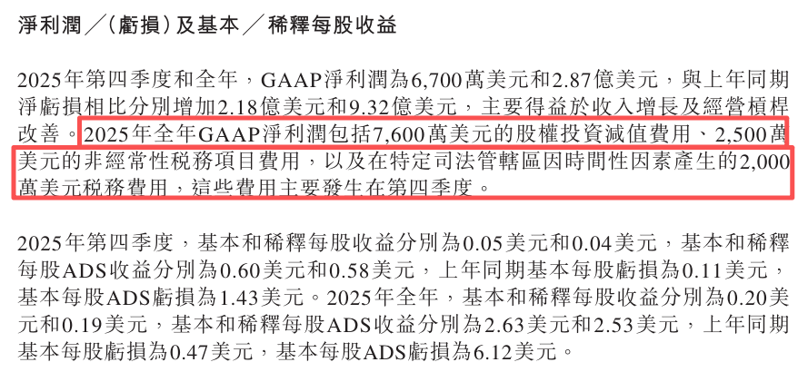 此外,一些技术性因素和外部环境也放大了股价的短期波动。2025年全年GAAP净利润中包含7600万美元的股权投资减值费用及2500万美元的非经常性税务项目费用,虽然这些非经营性因素不影响公司的核心经营能力,但也在短期内对GAAP净利润造成了一定扰动。