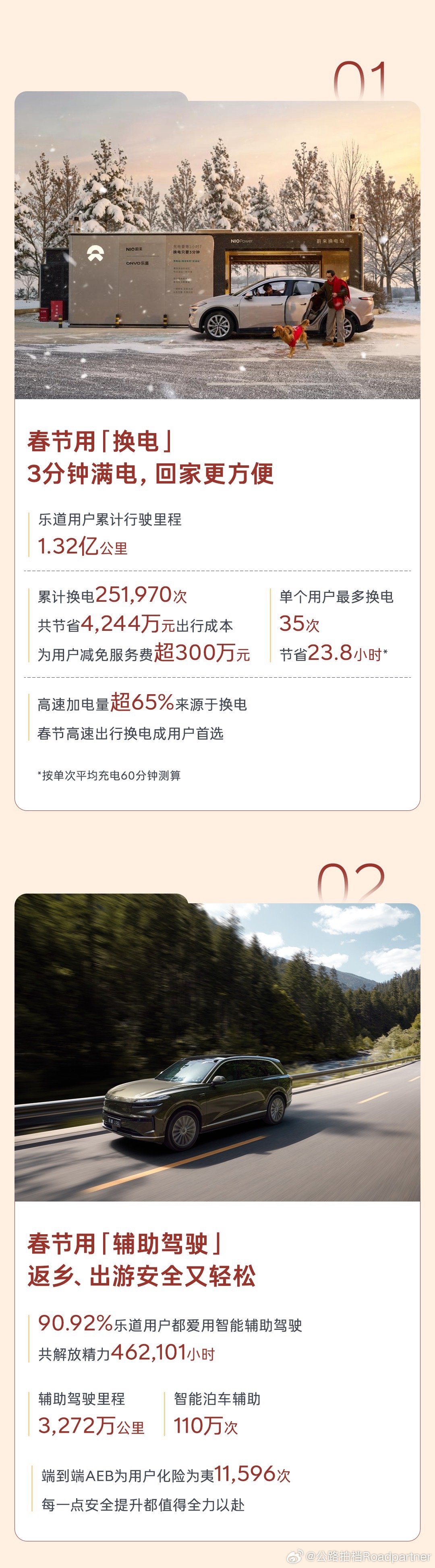 乐道春节期间,加电报告来啦,假期累计行驶1.32亿公里,换电251970次,重点