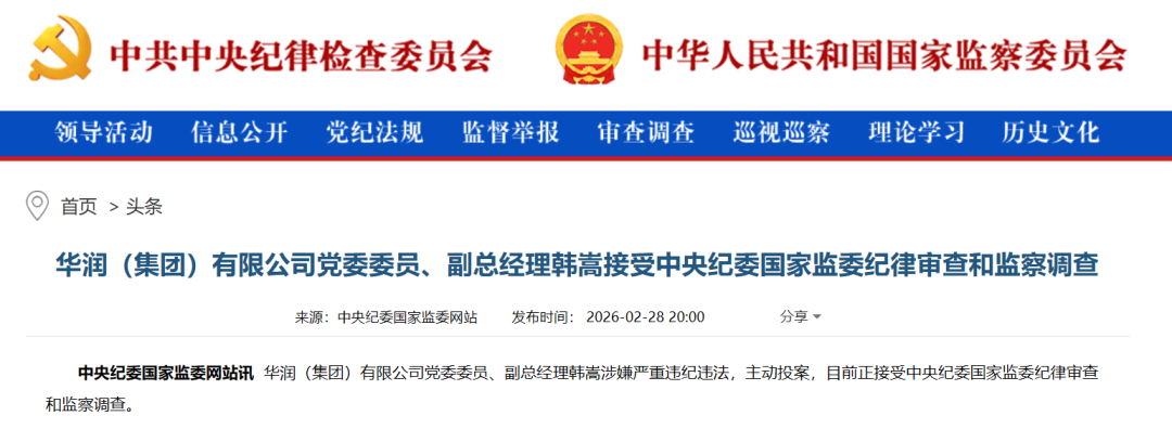 中央纪委国家监委网站2月28日消息,华润(集团)有限公司党委委员、副总经理韩嵩涉嫌严重违纪违法,主动投案,目前正接受中央纪委国家监委纪律审查和监察调查。