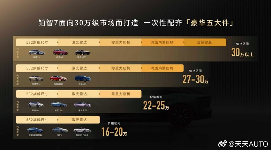 当这样一款产品杀入市场,我们很难不将它置于当前的竞争红海中审视。它的潜在对手名单星光熠熠:主打智能科技的小鹏P7i、定义中式豪华的比亚迪汉EV、流量王者小米SU7、以及电动标杆特斯拉Model 3。与它们相比,铂智7的优势并非简单的参数碾压,而是一种“体系化体验”和“可靠信任感”的复合型优势。铂智7的鸿蒙座舱+Momenta方案形成了“华为+丰田”的顶级合资智能组合,其流畅度和本土化体验已迎头赶上,而丰田在整车制造品质、底盘调校和品牌信赖度上的积累,构成了差异化的护城河。铂智7在智能座舱的交互先进性、底盘悬挂的高级配置(双腔空悬)以及设计的前卫感上,展现了更贴近新时代用户需求的姿态。它更像是一个“科技新贵”与“传统豪门”结合的产物。铂智7的优势在于其背后广汽丰田庞大的产销服务体系、历经市场检验的可靠性口碑,以及同样接入了小米生态的开放性。它用实体经济的厚重,去对冲互联网流量的浮夸。铂智7则在空间奢华感、乘坐舒适性、配置丰富度以及本土化服务上提供了截然不同的选择。它证明,电动豪华不止一种定义,可以很运动,也可以很从容。铂智7的竞争策略,清晰而聪明:它不与新势力们在单一长板上“肉搏”,而是凭借丰田的全球供应链、生产品控和品牌底蕴,打造一个“无短板”的六边形战士。它告诉消费者:你要的智能,我给顶流的;你要的豪华,我用料更扎实;你要的安心,我有终身保障。这是一种基于雄厚体系力的“降维打击”,而非营销话术。