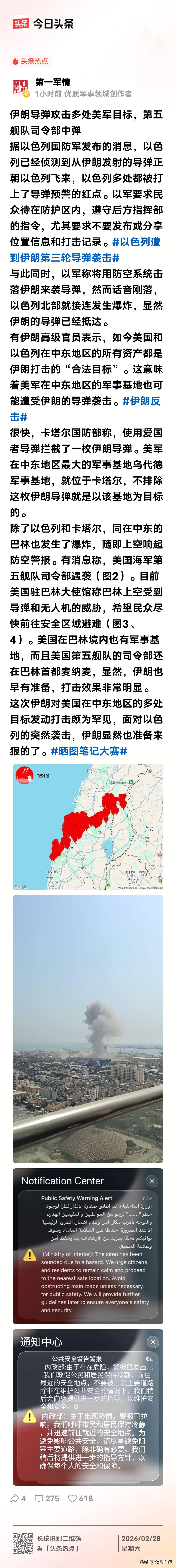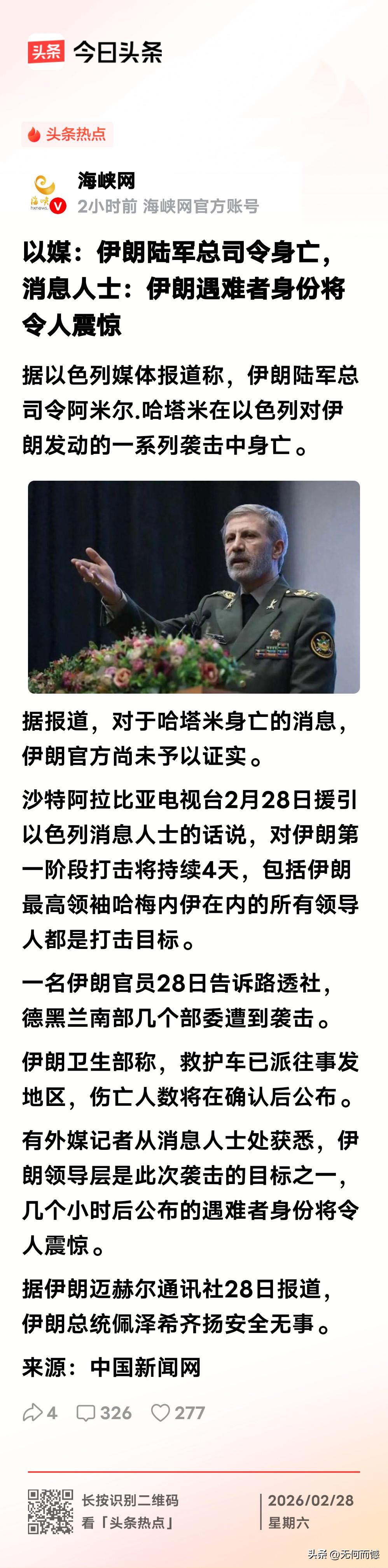 以色列透露,伊朗的陆军总司令已经阵亡了,而且还有一批阵亡高级将领的名单,也不知道这个消息属实不属实,同时又有消息报道,美国在中东的几个军事基地也遭到了伊朗的袭击,现在看来,中东地区真又变成火药桶,不知道什么时候能够平静下来!