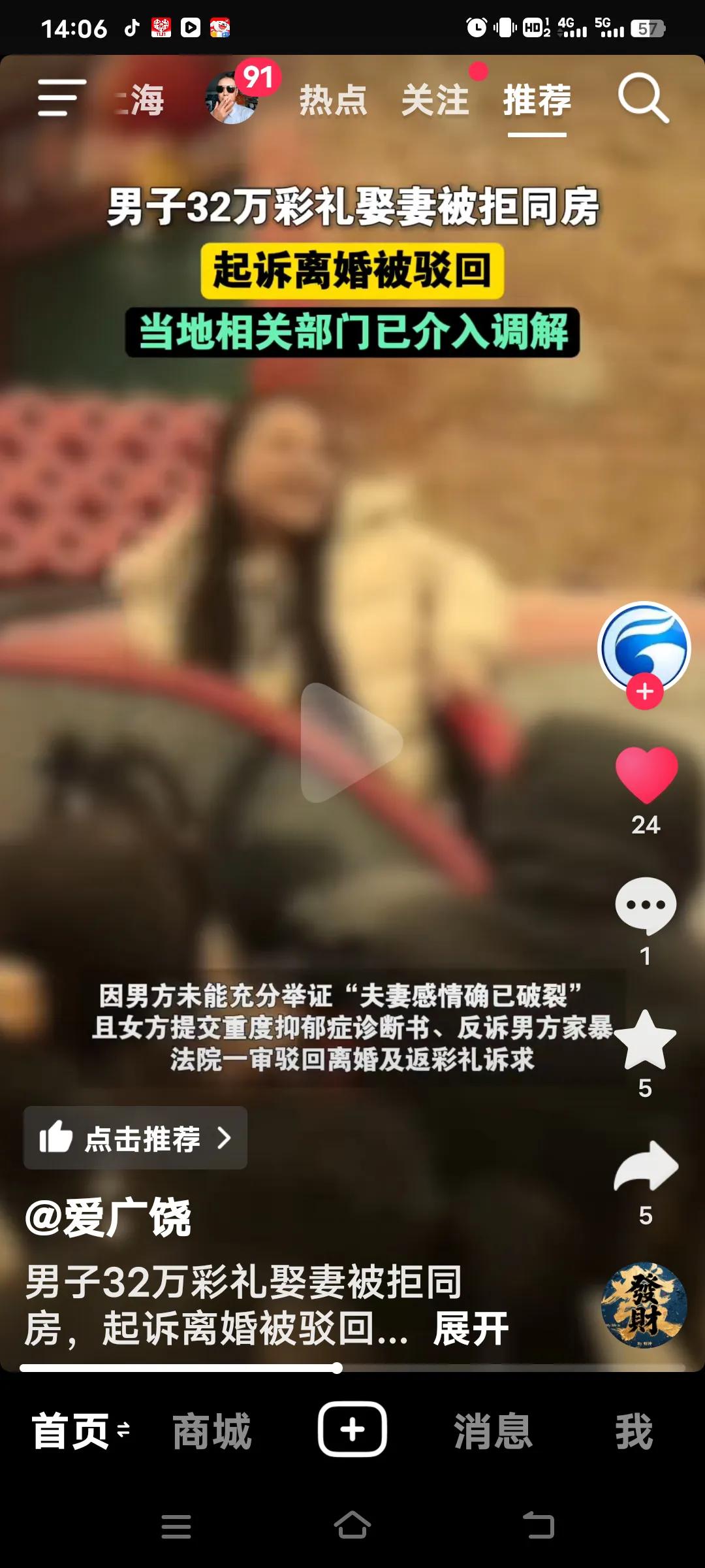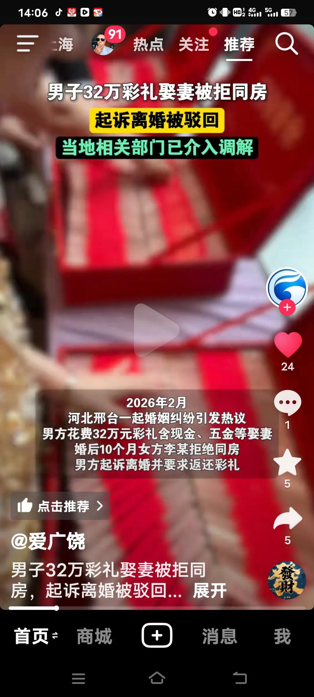 2026年2月,河北邢台的一起婚姻纠纷引发了广泛热议。高先生花费32万彩礼(包含现金、五金、手机)迎娶了妻子李女士,然而婚后10个月,妻子却拒绝与他同房,多数时间都住在娘家,即便回家也是分房而居。高先生无奈起诉离婚并要求返还彩礼,却遭到了法院驳回。 法院驳回诉讼请求,是由于男方证据不足。“婚后拒同房”并非直接的离婚事由,且女方在当庭明确表示不同意离婚。此外,女方还反诉男方家暴,并出示了抑郁症诊断证明。同时,法律保护女性的性自主权,单纯的“拒绝同房”并不能认定为过错。 由此看来,法院或许也需要重新审视当下的婚恋观了。几十万的彩礼砸进去,最后能落得什么呢?老一辈人都盼着儿子娶妻生子、抱上孙子,可如今不但孙子没盼来,女方反倒倒打一耙。可别最后落得个人财两空的下场!彩礼过高问题 彩礼纠纷