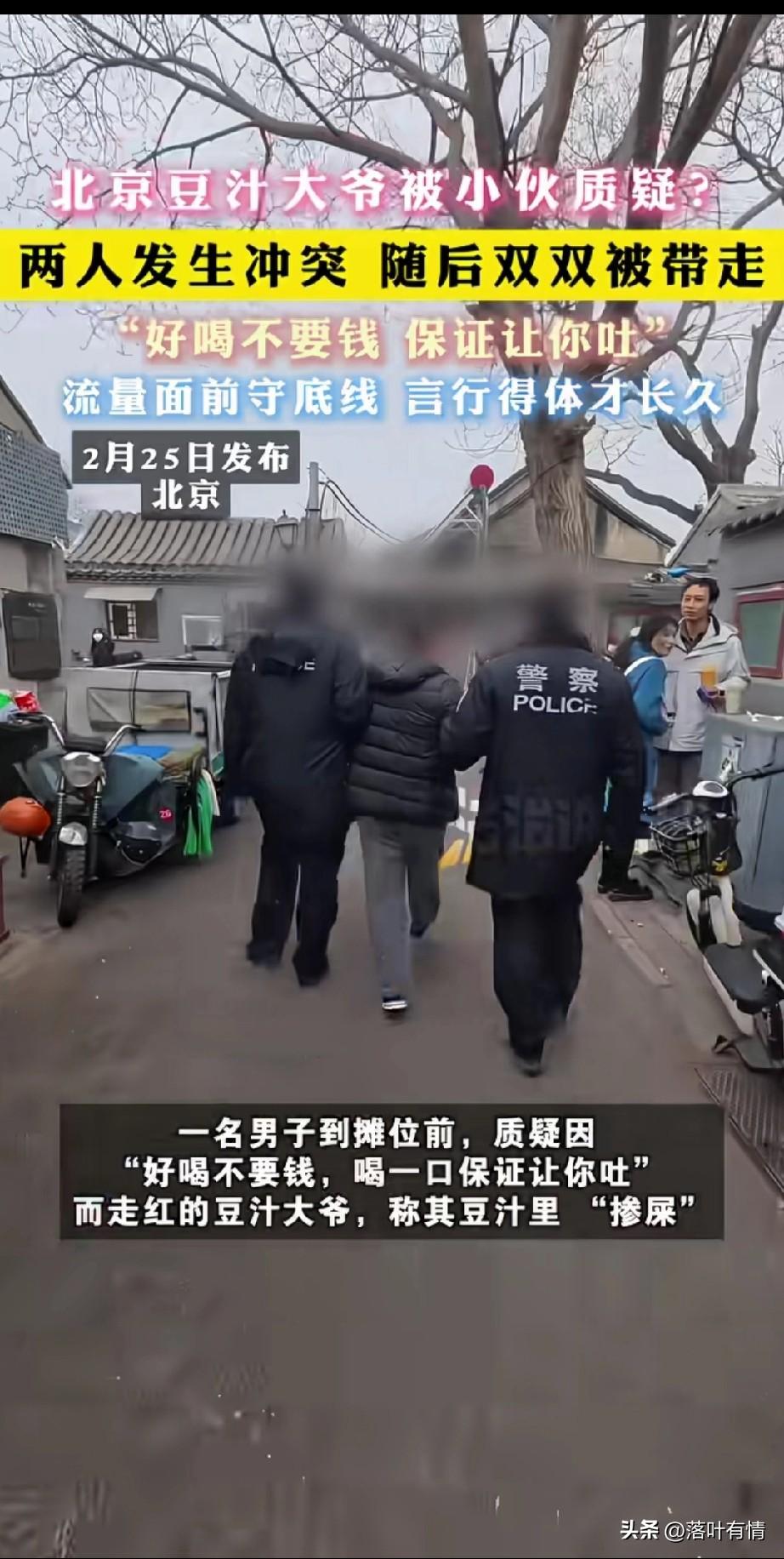 北京豆汁大爷被小伙质疑? 两个人发生冲突, 最后叔叔将小伙子带走了, 事情原来是这样的, 北京大爷用最难喝的老北京豆汁直接在网上爆火,现场来了很多年轻人和博主,他们纷纷对大爷进行了拍摄, 大爷也很开心这样的场面, 结果最恶心的一幕就出现, 一位小伙子喝了豆汁之后, 居然说这个豆汁里面掺屎了, 这直接可把大爷气坏了, 两人迅速开始了冲突, 旁边的年轻人只在旁边看戏, 有人还录了像, 小伙子非让大爷承认豆汁里面加屎了, 大爷求他,让他走, 结果小伙子却让大爷给自己磕个头, 然后再认个错就可以了, 这可激怒了大爷, 大爷说自己都60了, 你让我跟你磕个头,你算什么? 随后推了小伙子一下, 结果小伙子就说大爷打他了, 叔叔赶到之后就把闹事儿的小伙子带走了,还真是有人看不得你红! 为了流量连脸皮都不要了, 这样的事真的让人很无语! 大家对于小伙子碰瓷北京大爷最难喝豆汁这事怎么看? 北京 北京身边事 北京豆汁店 豆汁汁 豆汁特产