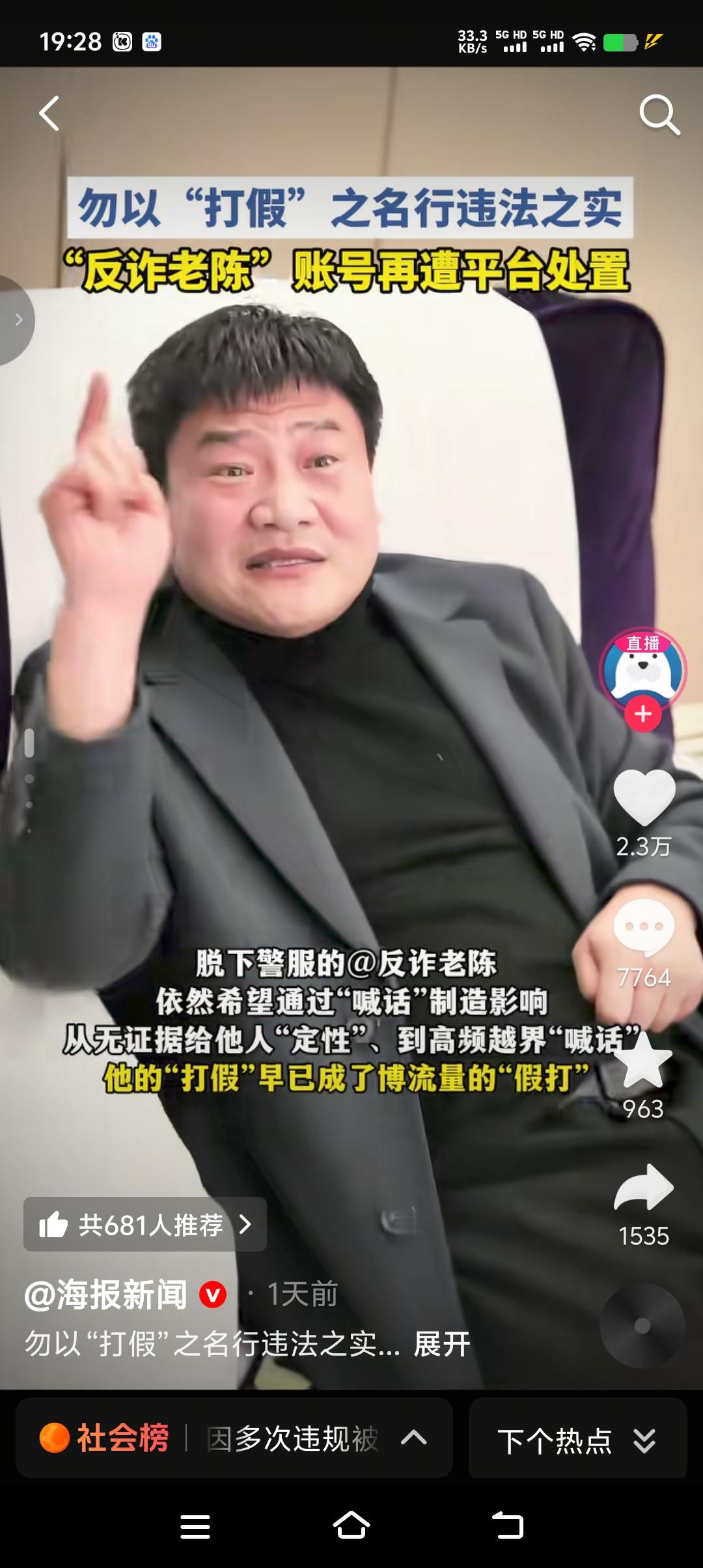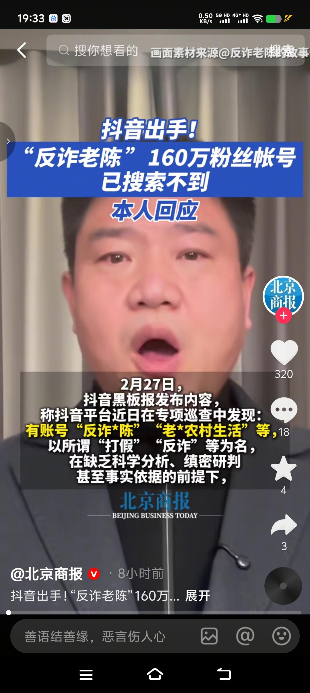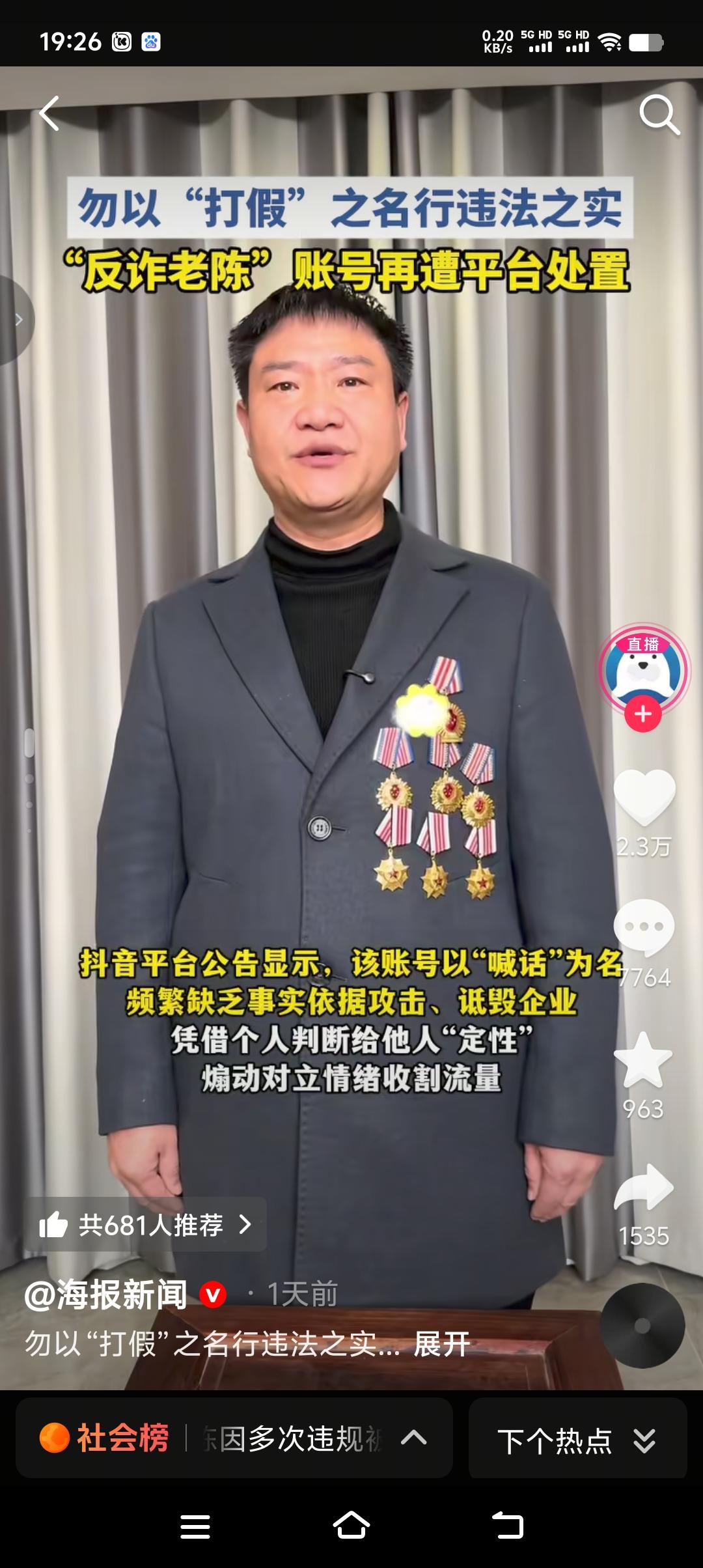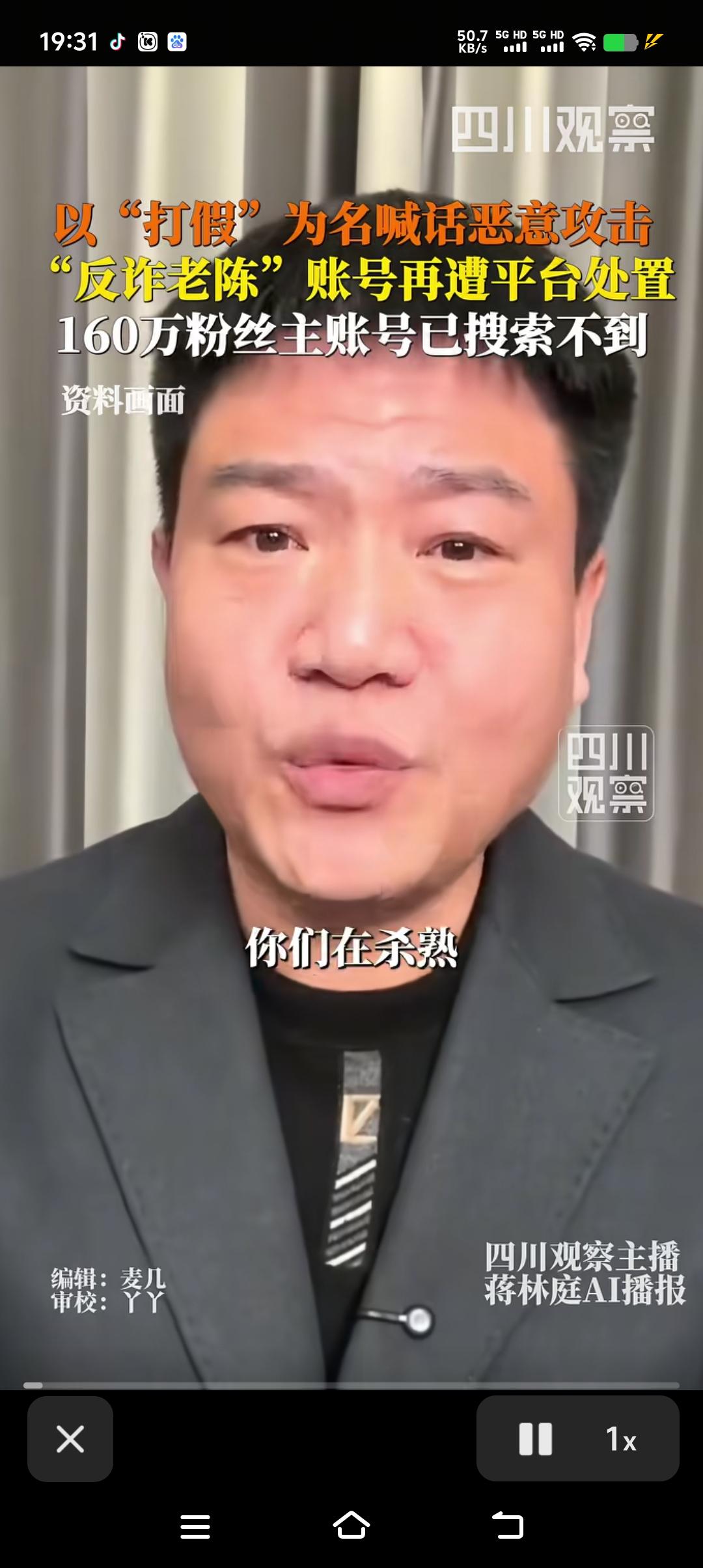 真是辛辛苦苦几十年,一觉回到解放前,反诈老陈160万帐号粉丝已搜索不到,也就意味着想吃抖音这碗饭又得一切从零开始。想当年老陈在没脱下这身警服之前,那可是风光无限,直播间人气爆棚,一晚上333个华子刷的老陈心惊肉跳,半天缓不过来神来。最终不顾家人和网友反对,毅然决然脱下警服做了一名专职主播。然而理想很丰满,现实很骨感,脱下警服的老陈发现不论自已怎么努力,流量再也回不到从前了,于是从操旧业再一次干起了自己的老本行“反诈”,隔空喊话打假。最终一个真正反诈的人一个有权反诈的人变成了一个为了流量而蓄意打假的人,后果也就可想而知了。
