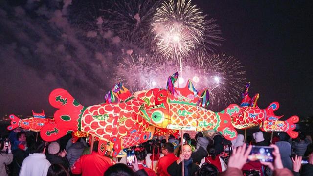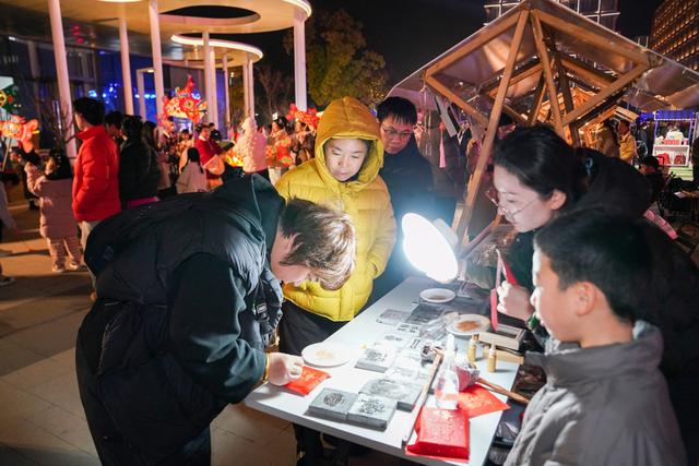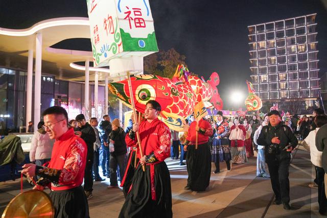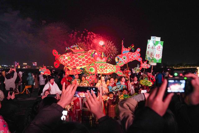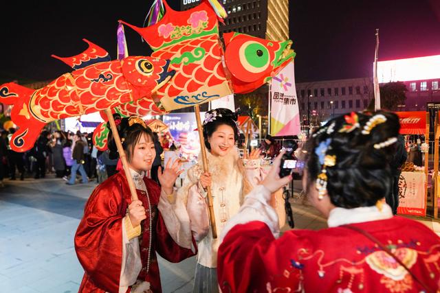 图灵集市现场,新年美陈与巨大灯笼装置前人头攒动,市民游客纷纷驻足打卡,造型灵动的传统鱼灯游摇曳穿梭,传递元宵佳节浓浓的热闹年味与传统韵味。
