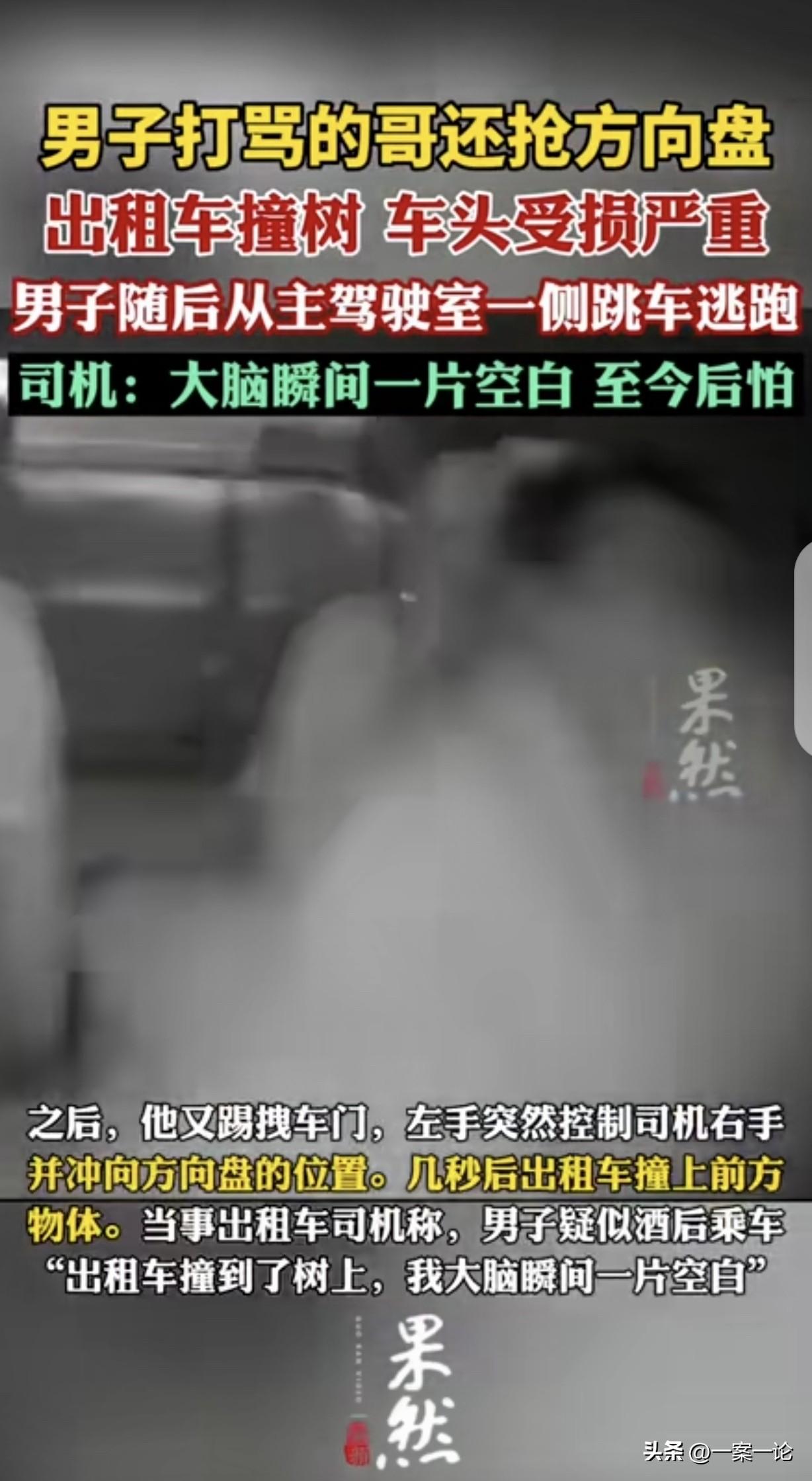 “酒壮怂人胆!”甘肃,一男子打出租车,跟司机炫耀:我打牌一局上万元,你能打几局?司机一看男子莫名其妙,也没搭理他,男子直接火了,骂司机是“怂货!”还用手打司机的头,说要揍死他,问司机信不信?然后,男子竟疯狂抢司机方向盘,导致出租车撞树上,车头撞的面目全非,好在司机身体无大碍。男子一看不好,跳车仓皇逃跑了。司机开了2年出租车,第一次遇到这事,至今后怕不已,他愤怒的报了警,结局悲剧了。 一辆出租车的行车记录仪正在无声运转,红色的时间码冷冷地跳动着。副驾驶座上,一个50岁上下的男人歪斜着身子。浓烈刺鼻的酒气在狭小的车厢里四处弥漫,一看就是刚从酒局上下来的主。 "我打牌一局上万元,你能打几局?"男人突然侧过身,把这句带着浓重醉意的话砸向身旁的代班司机张阳。 开了两年出租车的张阳死死握着方向盘,眼睛紧盯前方的路,没吭声。他压根不想搭理这种酒精上头后的荒唐炫耀。 沉默,本应是无声的内敛,却在某些时刻,如同一根点燃炸药桶的火柴。它于悄然间引发轩然大波,将平静打破,让隐匿的矛盾瞬间爆发。男人瞬间暴怒,手指直戳张阳的鼻子破口大骂:"你个怂货!" 话音刚落,巴掌就狠狠拍在了张阳的脑袋上。"我要揍死你,信不信?"男人的嘶吼在封闭的车厢里来回撞击。 他如困兽般陷入疯狂,双手疯狂拍打、双脚奋力踢踹着车门,那失控的模样,似一头被囚困的野兽,在狭小空间里徒劳地宣泄着愤怒与不甘。刹那间,他蓦然朝着张阳猛扑过去,双手如铁钳般紧紧抠住方向盘,用尽浑身力气疯狂拉扯,那场景惊心动魄。 仅仅两三秒。失控的出租车像脱缰的野马,瞬间偏离路线,径直冲向路边的行道树。"砰"的一声沉闷巨响。刹那间,车头遭受猛烈撞击,变得支离破碎、面目全非。 无数碎玻璃如暴雨般倾洒而下,在地面上肆意铺陈,一片狼藉。副驾驶一侧车门遭受树干挤压,形变程度极为严重,原本规整的车门如今扭曲不堪,仿佛被一只无形的巨手肆意揉捏。 张阳的大脑一片空白。安全带死死勒住了他的身体,万幸没有大碍。但他清清楚楚地看到,旁边那个狂躁的男人满脸是血。 时间仿佛凝固了。大约26秒后,男人发现副驾门根本推不开,连滚带爬地从主驾驶这一侧窜了出去,消失在夜色里。 这是张阳跑车的第二年,从来没碰过这种要命的事。缓过神来的他,摸出手机愤怒地报了警。 警方的反应极快。顺着监控一路摸排,那个因撞击而伤了肋骨的逃亡者很快落网。关于他的身份,当地传得沸沸扬扬。 有人说他是大生意人,也有人咬定是公职人员。直到2月28日,临洮县交通运输局亲自把底牌亮了出来。 官方出面辟了谣:这就是当地一个普通的县城居民。而这个案子一上来,就走了非常规的路线。 交警大队接手后,直接把案子移交给了北关派出所。紧接着,案卷又被火速递进了县公安局刑警大队。 这说明什么?案件的性质全变了。在法律这盘棋里,这根本不是什么醉汉寻衅滋事的普通戏码。 出租车作为公共交通工具,抢夺方向盘这一行为,无异于将路上行人与车辆的安危置于赌局。此举动把众人生命当作筹码,置于险地,何其危险。 律师赵良善直接把法条剖开。危险已经实实在在地砸下来了,这就完全触发了刑事追责的红线。 这在司法上叫罪名竞合。《刑法》第114条的"以危险方法危害公共安全罪",起步就是三年,最高十年。 另一个是"妨害安全驾驶罪",一年以下。司法机器的运转逻辑很冷酷:重罪吃掉轻罪,直接按前者算。 有人以为喝醉了能当免死金牌?别傻了。在法官眼里,饮酒状态下抢夺方向盘,主观恶性反而更大。 当前,车主张阳已与该男子签订民事赔偿协议,并且出具了谅解书。此协议的达成,或为双方矛盾化解开启新章。看起来他似乎能逃过一劫? 完全没戏。这种危害公共安全的重罪,谅解书顶多是个折扣券,最多把基准刑期砍掉百分之四十。 国家追诉权不可能因此作废。更要命的,是他撞车后仓皇逃窜的那致命的26秒。 那一跑,不仅把自首的减刑机会丢了个干干净净,还给自己牢牢贴上了"逃避责任、无悔罪态度"的标签。 等待法庭落槌时,这绝对是一个要被酌情从重的加码砝码。冲动,宛如一匹脱缰野马,肆意狂奔。而冲动的代价,于无形之中,早已被标上了令人咋舌的天价,时刻警示着人们莫要被冲动冲昏头脑。 男人在医院躺了多日,现在虽然出院了,但刑事立案的侦查网已经收紧,等待他的将是铁窗生涯。 为了那句无人搭理的万元赌资炫耀,一个普通人在酒精的裹挟下,硬生生把自己的人生方向盘拽进了深渊。