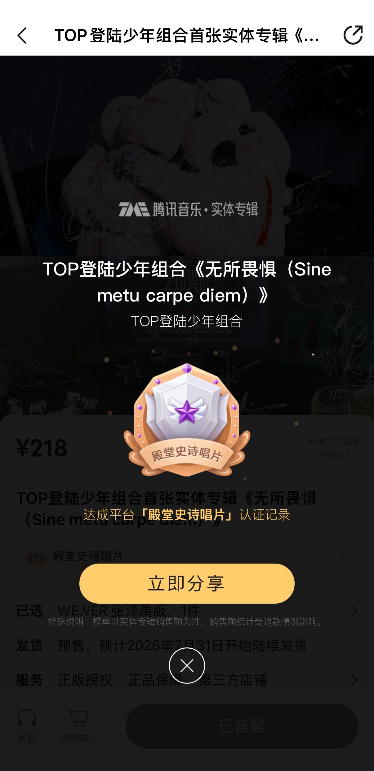 TOP首专成绩TOP首张实体专辑《无所畏惧》达成「殿堂史诗唱片」认证,谁抢到了我