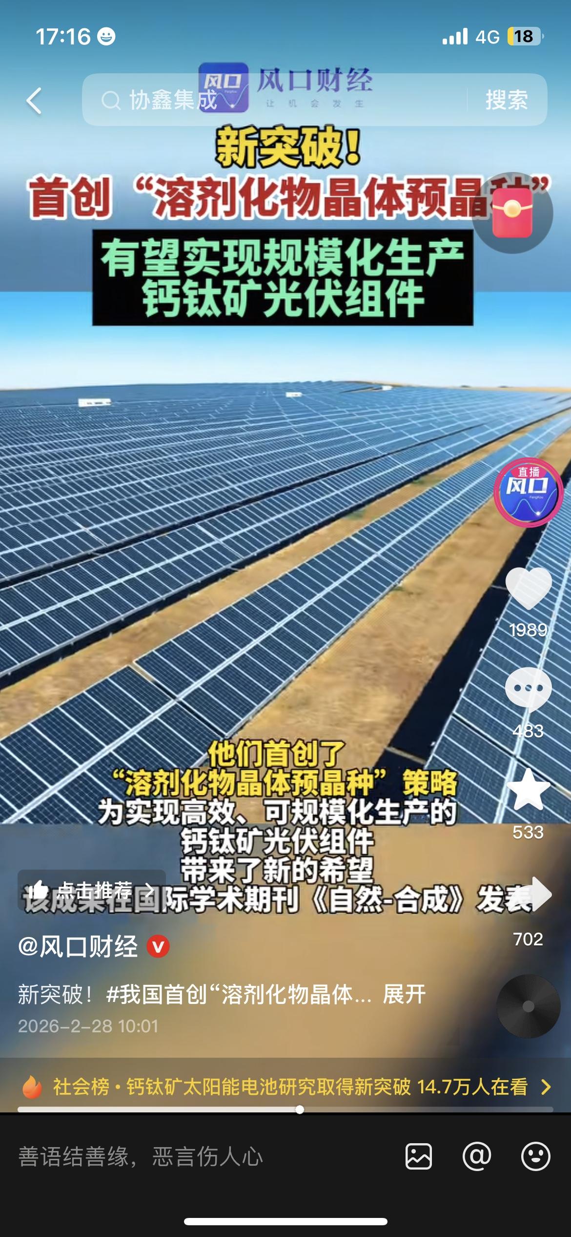 中国又一项关键技术突破,钙钛矿光伏可能要迎来真正的量产时代了。 中科院和港科大团队,首创“溶剂化物晶体预晶种”方法,直接解决了钙钛矿电池稳定量产的大难题。 以前钙钛矿效率高、成本低,就是不好大规模做,现在这个卡点被打通,未来光伏成本还能往下压。 说白了,这不是实验室噱头,是真能改变能源行业的硬突破。 以后家里装光伏、用电成本更低,相关行业的机会也会越来越多,科技进步真的在悄悄改变生活。 钙钛矿光伏 中国科技突破 新能源