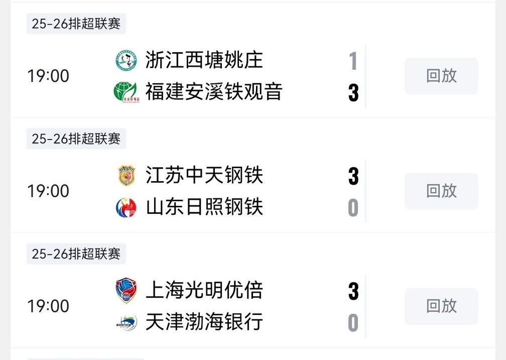 2025-2026女排超级联赛季后赛第二轮比赛今天开打,对阵情况为天津对上海、北京对河南、浙江对福建、江苏对山东,结果上海、江苏稳定发挥都是3:0战胜对手,这两支球队也是本赛季最后的冠军争夺者,今天的比赛也爆出一个冷门,河南经过五局大战最后以3:2战胜北京,河南获胜也让进四强的队伍有了更多悬念,另一场福建以3:1战胜浙江。