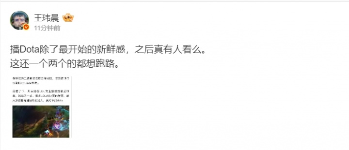 对此体坛周报记者王玮晨锐评:播Dota除了最开始的新鲜感,之后真有人看么。