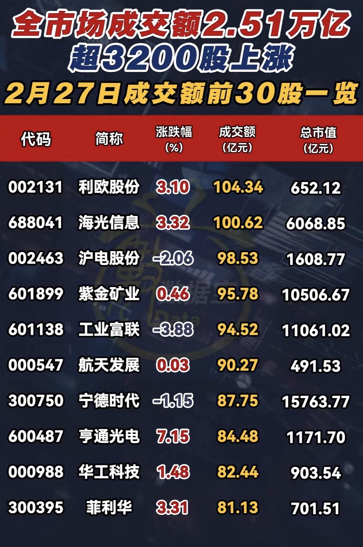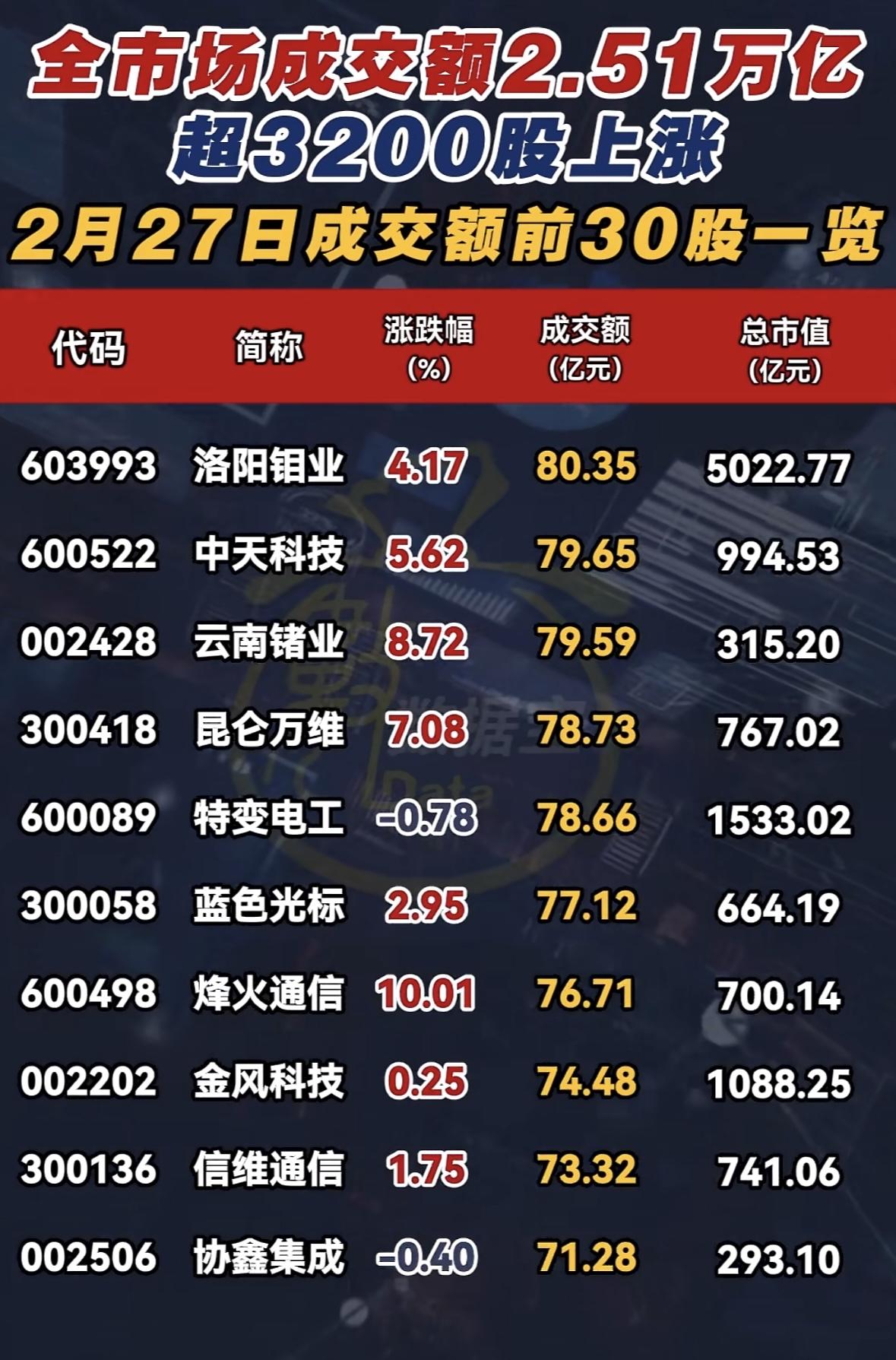 2月27日这股市行情真是让人眼前一亮!当天超3200股上涨,市场一片红火。看看那前30强成交额,简直是股市里的“尖子生”。这3200多只上涨股票就像一群欢快的小马,在股市赛道上你追我赶。对于股民来说,这无疑是个好消息。说不定好多人账户里的数字蹭蹭往上涨,心里乐开了花。不过呢,股市这东西向来变幻莫测,今天涨势好,明天也可能风云突变。还是得谨慎对待,这前30强成交额里,说不定就藏着未来的潜力股,就看谁有慧眼能发现啦!