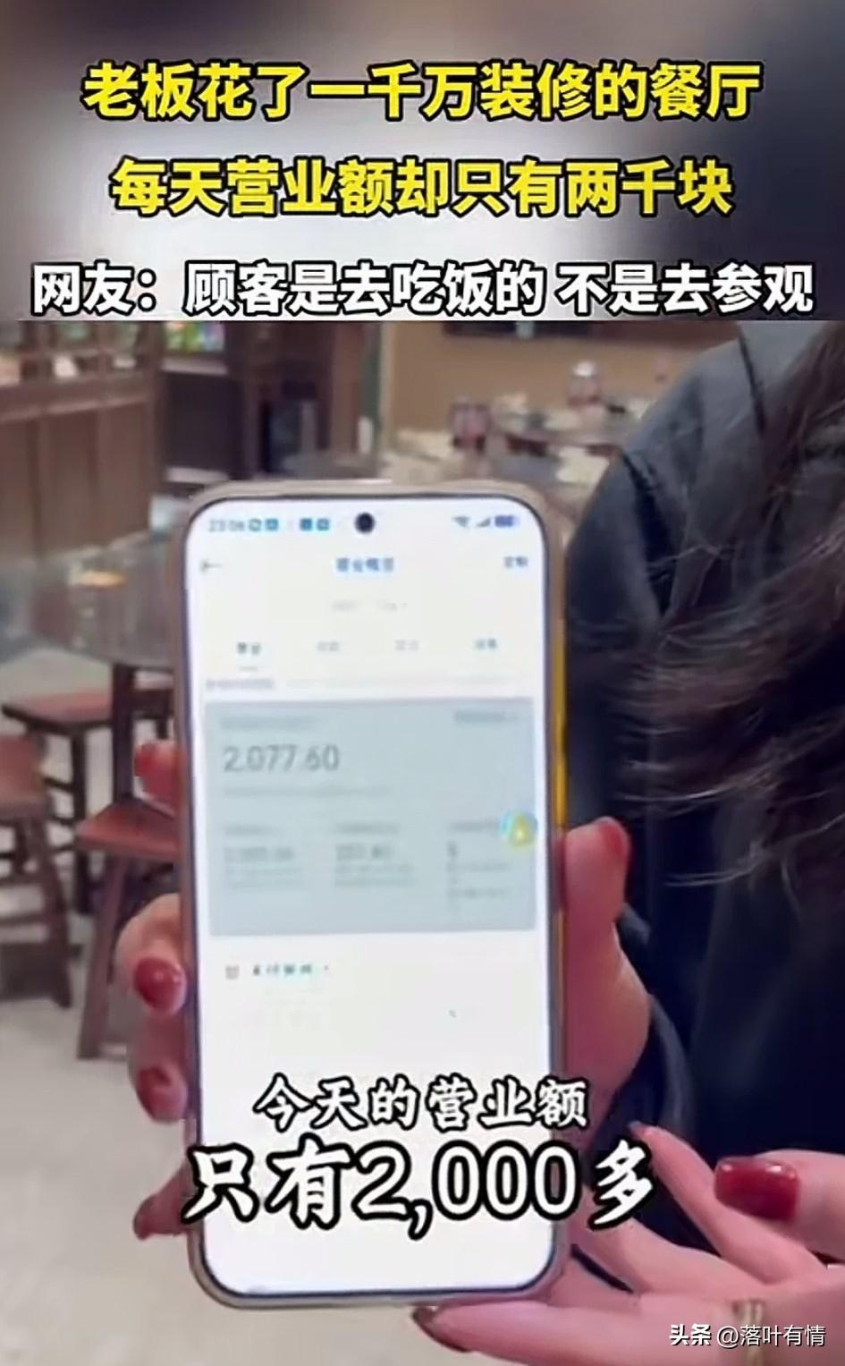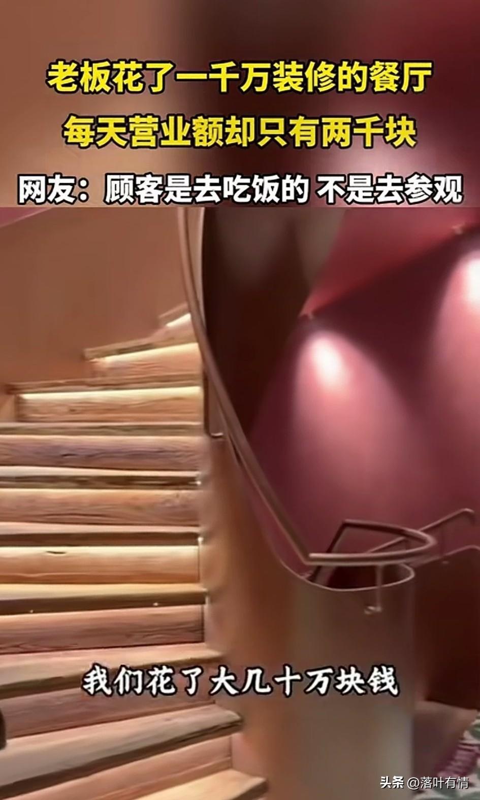 女子讲述了自己开闽南菜馆, 花了1100万做装修, 结果一天的营业额才2000多, 这可是在河南的省会郑州开的, 她也没有想到生意会这么差, 她给大家介绍了自己的餐馆, 古风加上欧式装修, 看起来真的很有情调, 很多地方都是用了心做的装修, 而且她的菜馆有三层, 还花了几十万做的旋转楼梯, 让人感觉这里很高级, 不过郑州虽然作为省会, 工资水平真的很低, 说白了还不如小县城, 啥都在涨工资不涨, 普通老百姓肯定没有那么多钱去消费, 这两年郑州的餐馆倒了很多, 女子的朋友也劝她把店关, 还有人让他换个地方再开, 可她却舍不得, 因为她现在的装修成本都没有收回来, 这可是花了1100万的装修, 她把自己的经历分享在了网上, 结果网友却表示顾客是你去你家吃饭, 不是去你家参观的! 大家觉得开个餐馆需要花那么多钱装修吗?
