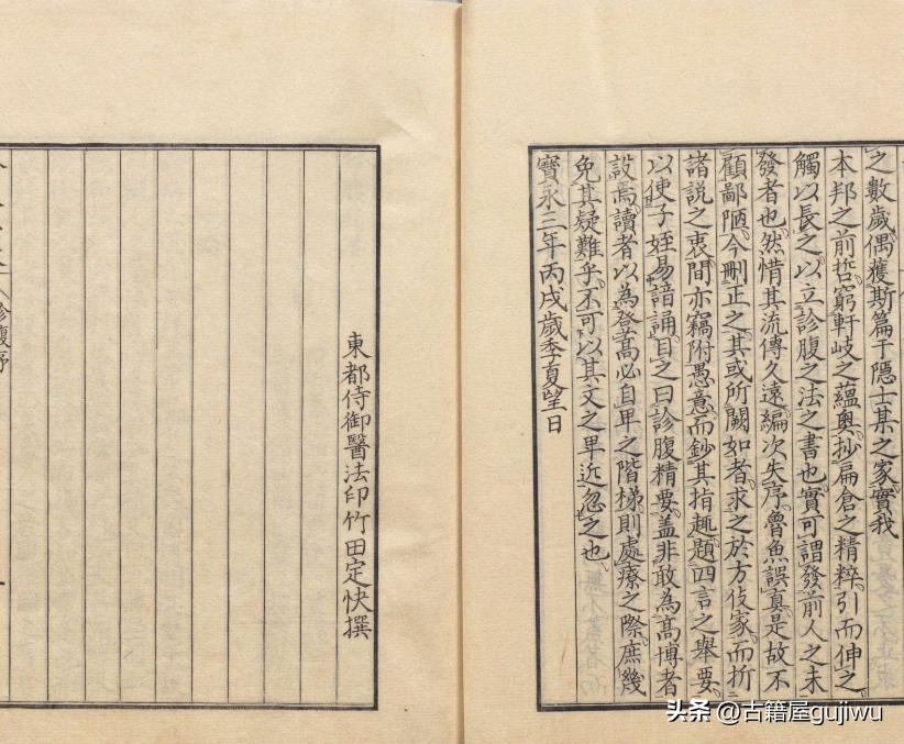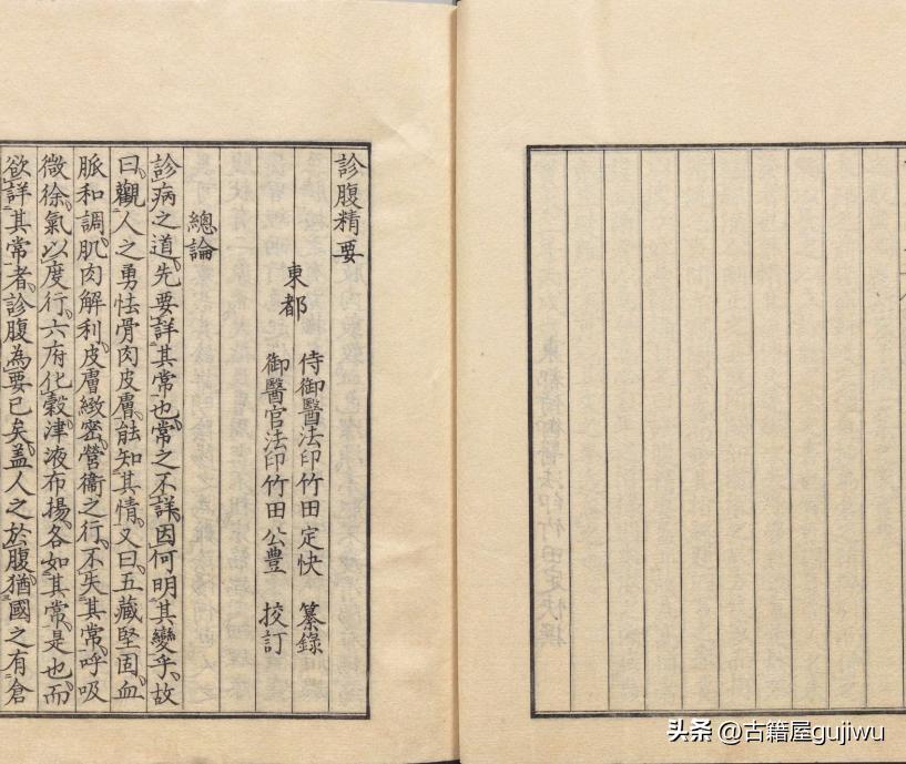 中医诊法古籍《诊腹精要》 📖页数: 26双页50页 🆕简介:《诊腹精要》《诊腹精要》,选自汉方医御医官法印竹田公豊所著的《诊家要诀》,刻于宽政五年(公元1793年)。而《诊腹精要》,据传为日本汉方医腹诊的开山之作,由东都侍御医法印竹田定快撰写于宝永三年(公元1706年)。中医诊法相关古籍。