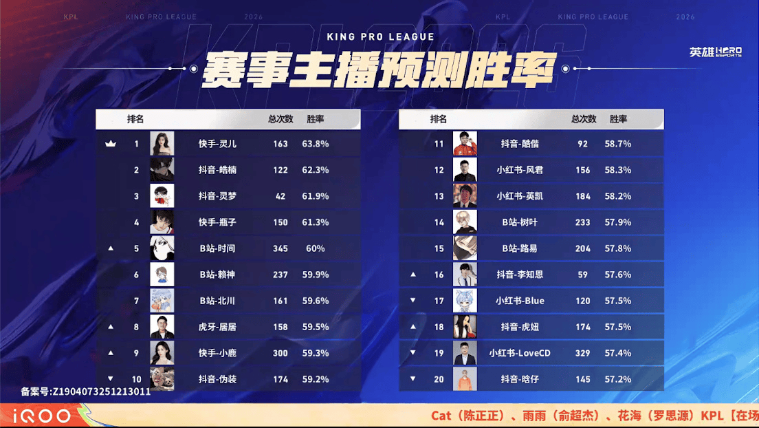 快手-灵儿胜率63.8%,位于排行榜第一。