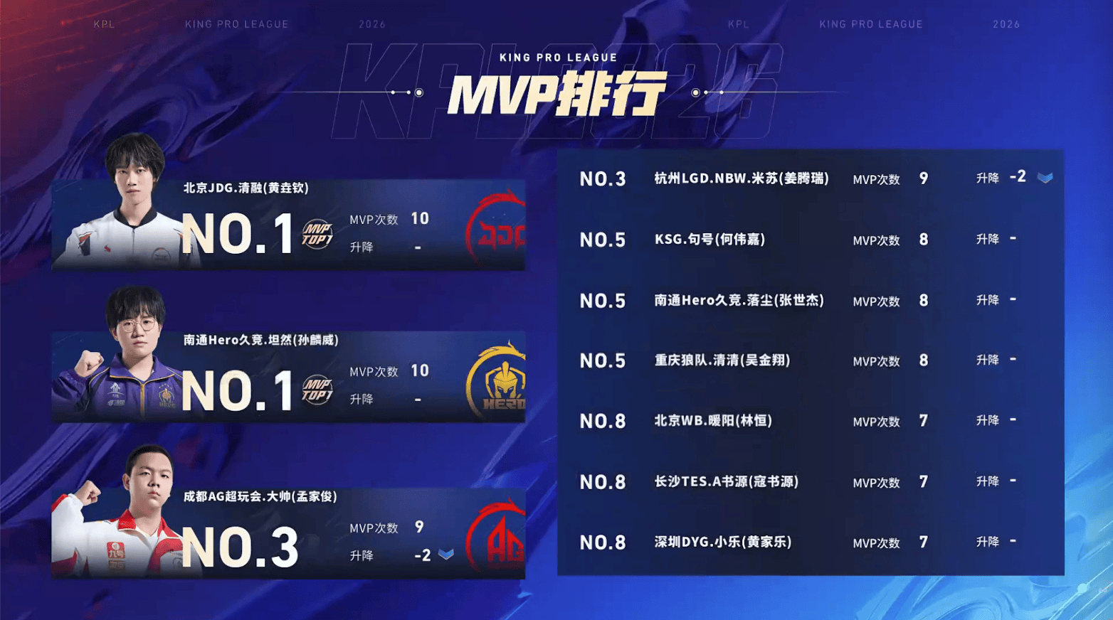 JDG清融v(黄垚钦)、南通Hero久竞_坦然(孙麟威)累计获得10次MVP,并列第一;