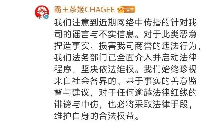 12月26日下午,霸王茶姬官方回应表示:“我们注意到近期网络中传播的针对我司的谣言与不实信息。对于此类恶意捏造事实、损害我司商誉的违法行为,我们法务部门已全面介入并启动法律程序,坚决依法维权。”