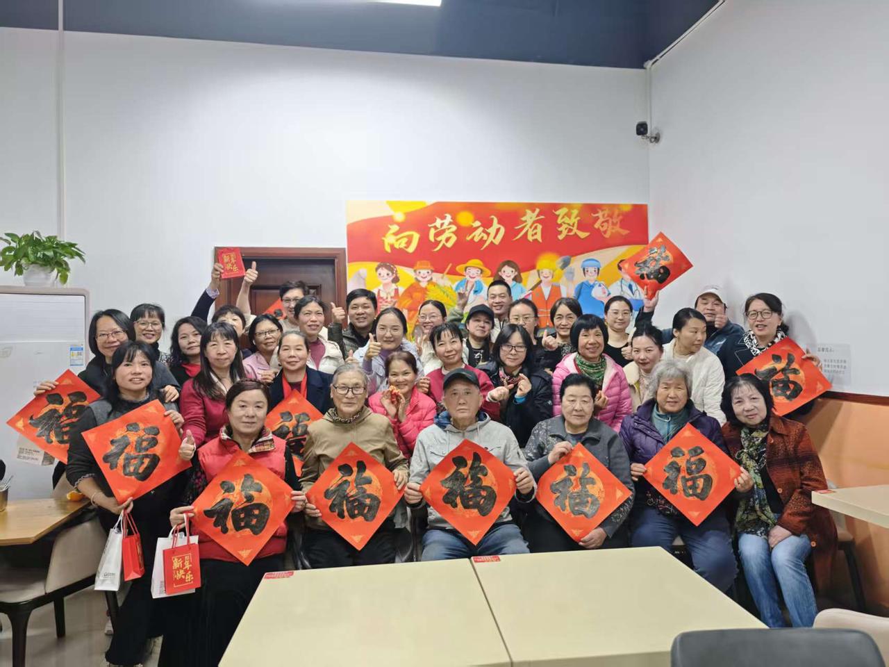 劳动者们在工会年夜饭现场合影。
