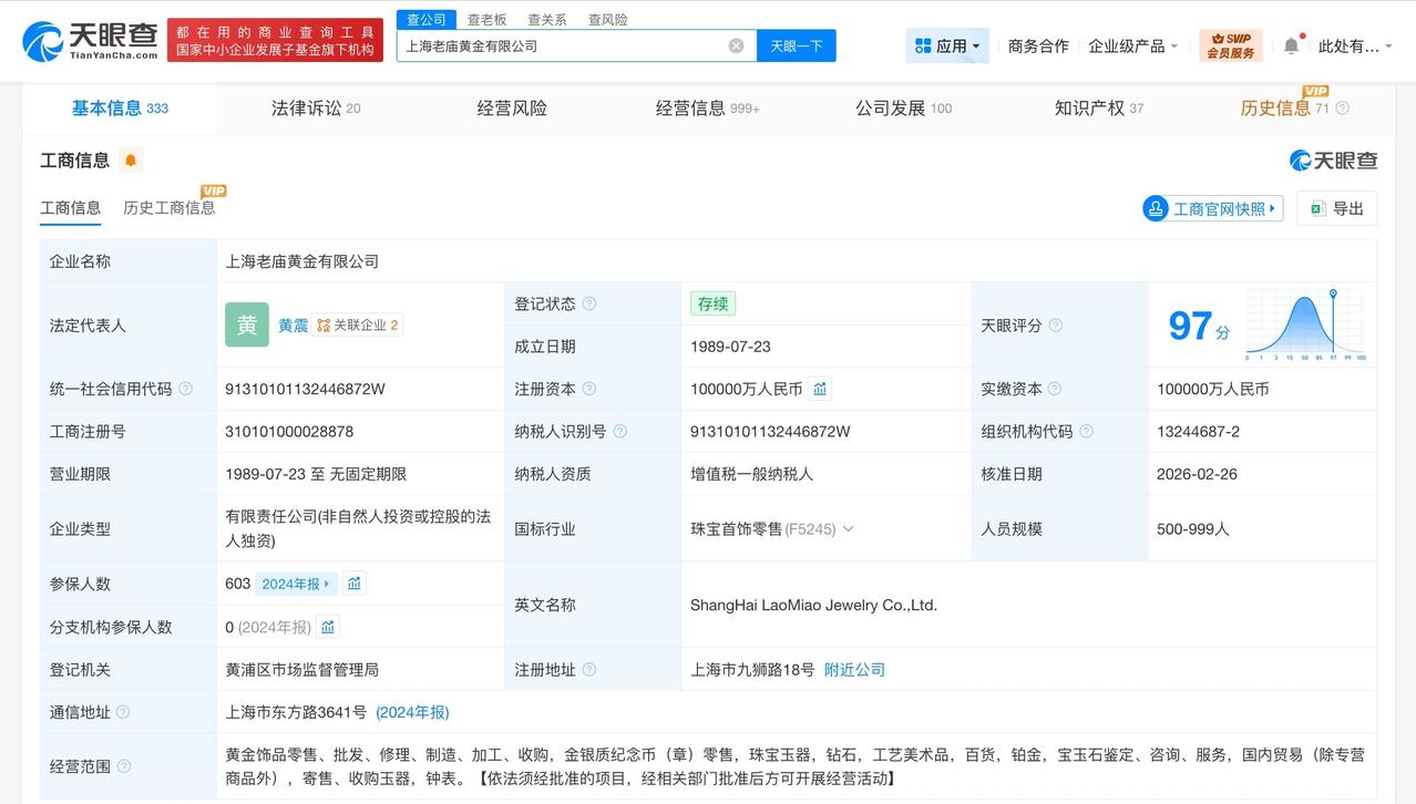 老庙黄金法定代表人发生变更 天眼查App显示,近日,上海老庙黄金有限公司发生工商变更,张剑卸任法定代表人、执行董事,由黄震接任法定代表人并担任董事。 上海老庙黄金有限公司成立于1989年7月,注册资本10亿人民币,经营范围含黄金饰品零售、批发、修理、制造、加工、收购,金银质纪念币(章)零售,珠宝玉器,钻石,工艺美术品,百货,铂金,宝玉石鉴定等,由上海豫园珠宝时尚集团有限公司全资持股。 天眼查信息: