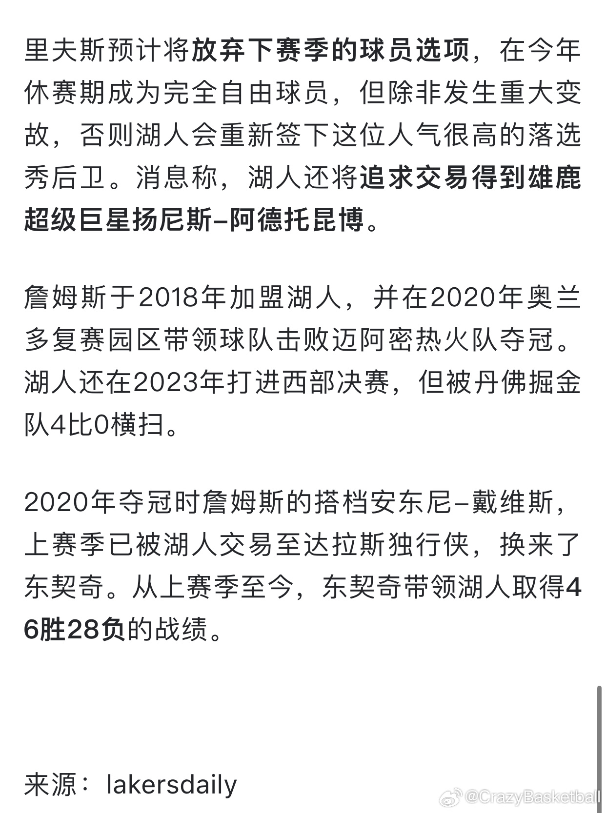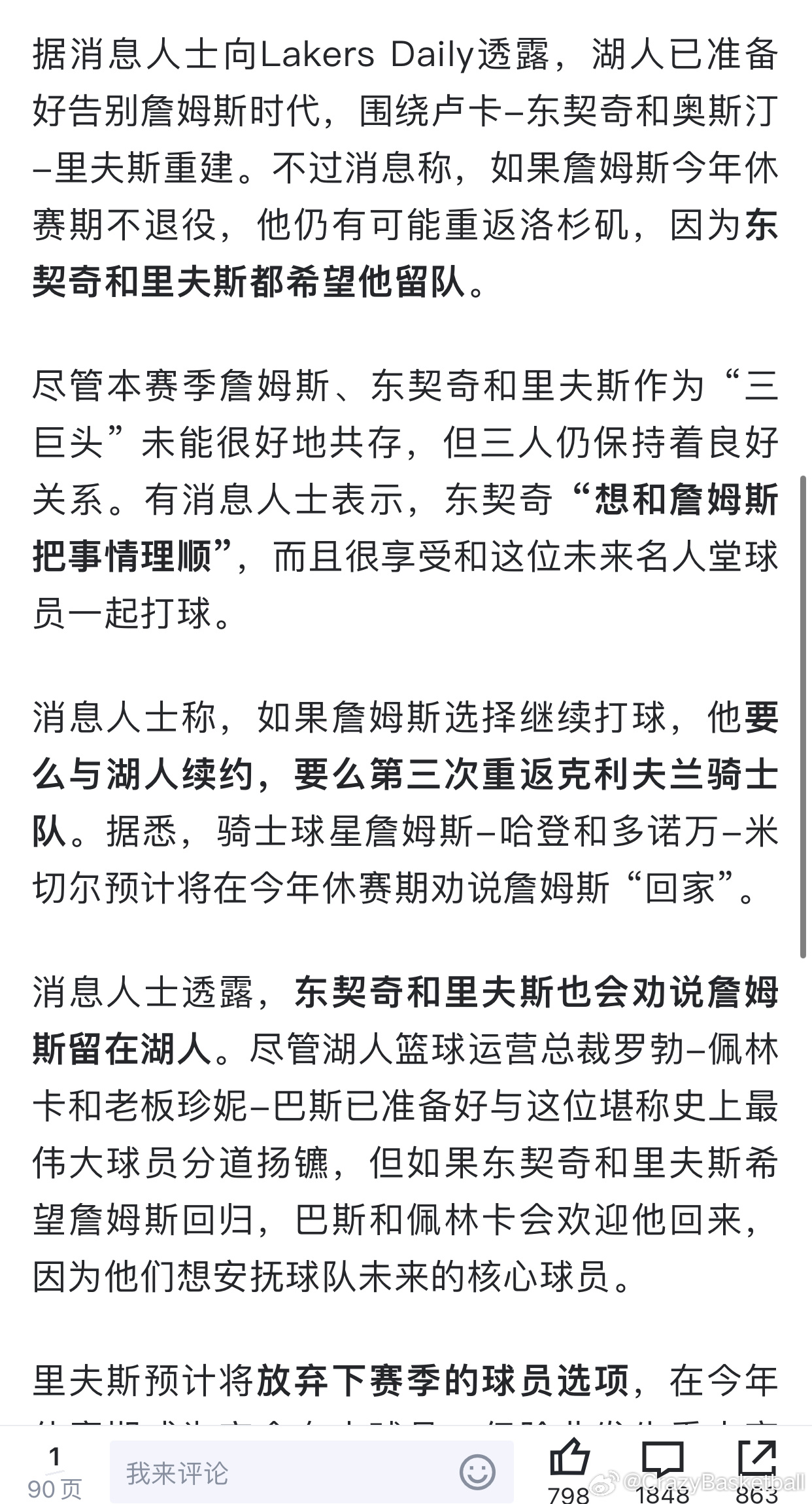 这篇文章最牛的地方就是把东契奇和里弗斯放到火架上烤,同时自己不至于尴尬狼狈可以全身而退!1、明年只要湖人不给詹姆斯合同,那就是你东里二人不想留或者没开口替老詹说话,那就是得罪我老詹,以后在联盟也别想混得舒服。2、明明是湖人觉得老詹不值那个价钱不愿意给合同,老詹不得不灰溜溜离开找下家,直接变成了是当家球星东契奇和里弗斯不想要我,那我有的是人要,你俩锅背好,我再想办法骗下一家弄个合同3、阳谋和阴谋双轨推进,还释放出东契奇和里弗斯目前是希望詹姆斯明年留下来的,傻子都能看出来东契奇不想,这一招让东契奇和里弗斯很可能就被迫向湖人开口挽留,无论如何老詹将立于不败之地一代巨星,生涯最后这样乞讨要饭真的没必要,尊严都没了,现在退役也是荣耀满身了,至于荣耀怎么得来的,多年之后人们也会忘记,只会记住有数据统计的内容,体面退场何乐而不为!